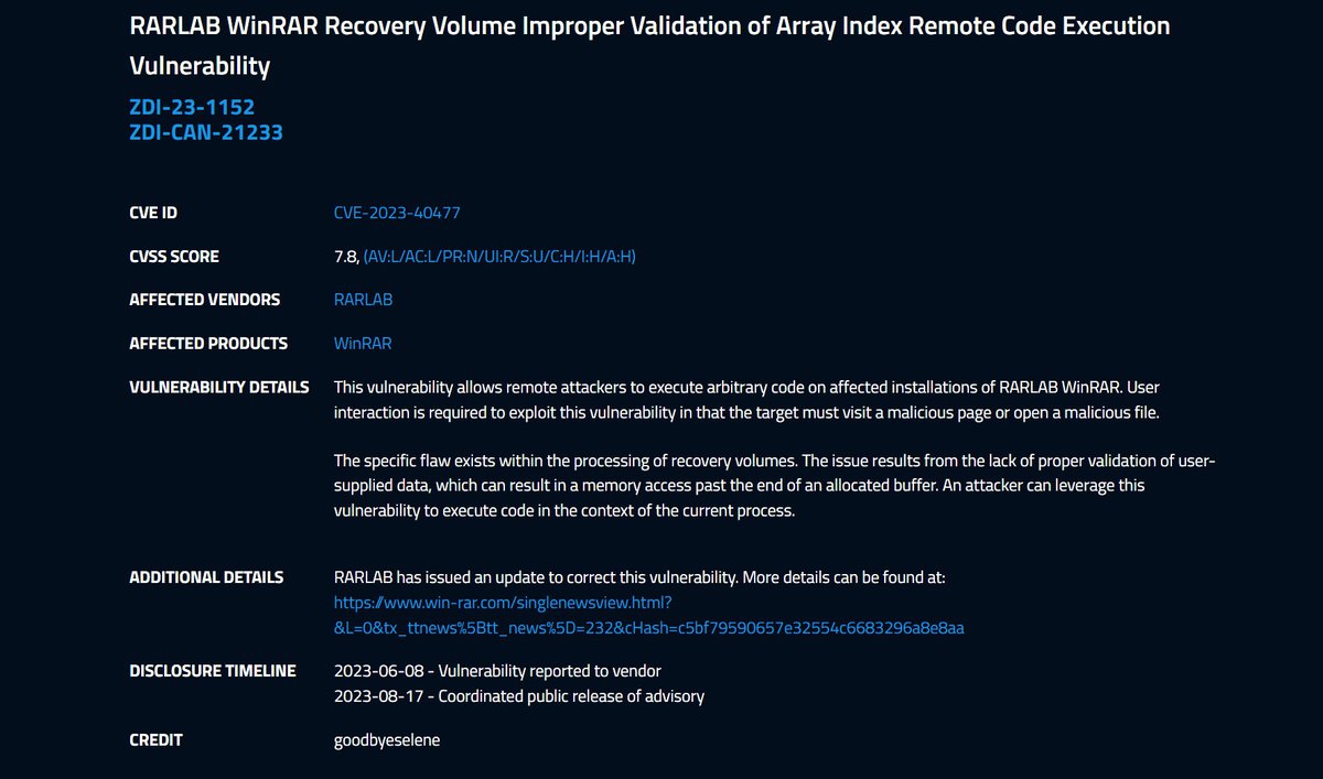 Уязвимость, получившая идентификатор CVE-2023-40477, была найдена в начале июня, на ее исправление ушло около двух месяцев. Эксплойт закрыт в WinRAR версии 6.23, пользователям приложения стоит как можно быстрее обновиться до этой версии.