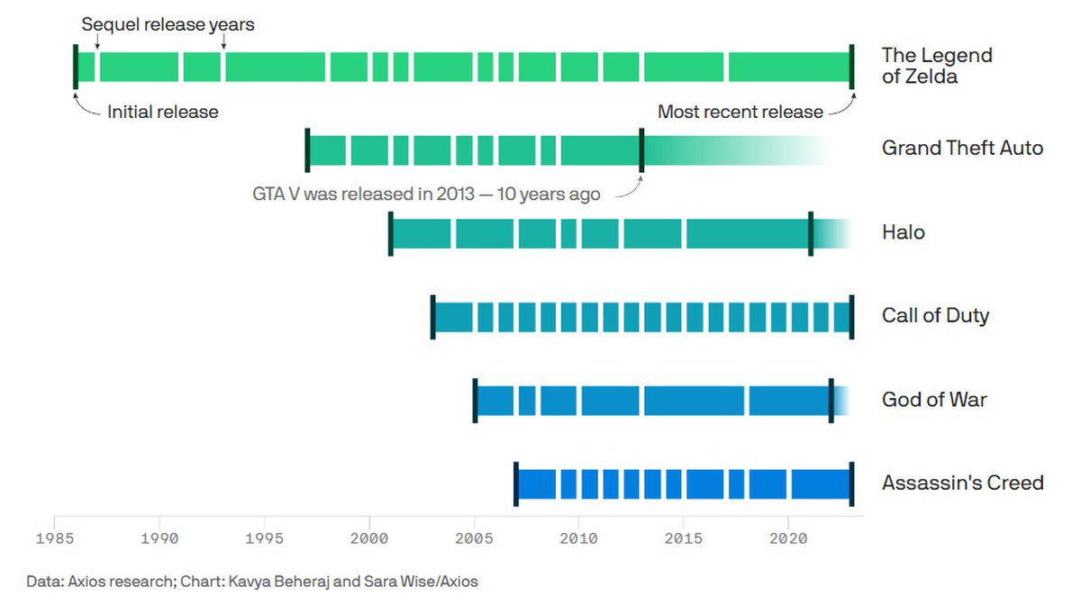 Сейчас, обращает внимание издание, на разработку новых частей Halo, Forza, The Legend of Zelda, God of War или Assassin's Creed уходит гораздо больше времени, чем десятилетие назад. Прежде было нормально, если новая игра выходила раз в год или в пару лет.
