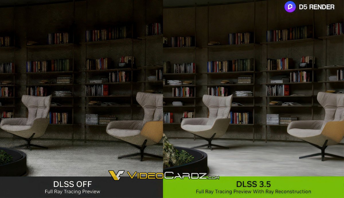 Судя по сравнительным кадрам, показанным Nvidia, в некоторых случаях использование DLSS 3.5 позволяет повысить качество трассировки лучей. Это происходит благодаря более качественному шумоподавлению; использование обычной версии шумоподавления убирало часть важных данных.