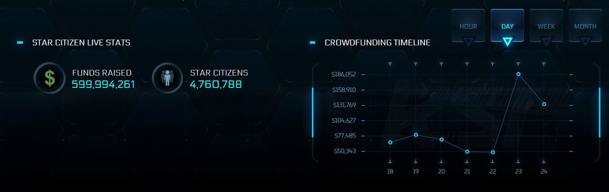Бюджет разработки космического симулятора Star Citizen с минуты на минуту превысит $600 миллионов. К вечеру 25 августа разработчики привлекли $599994261 от более чем 4.76 миллиона игроков.