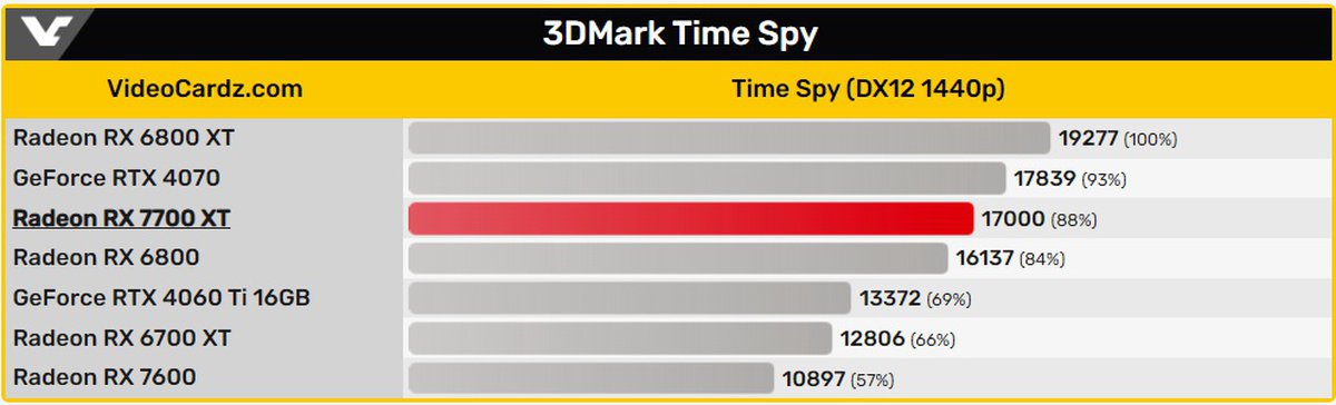 В распоряжении Tom's Hardware появились результаты прогона видеокарты Radeon RX 7700 XT в бенчмарке 3DMark Time Spy. Карта показала производительность на уровне GeForce RTX 4070.