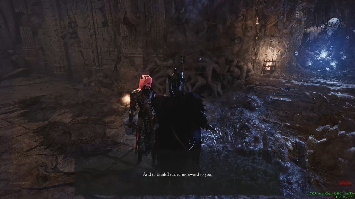 Интересный момент: время от времени демонстрационный билд Lords of the Fallen подглючивает. Например, один из персонажей обзавелся розовым «шлемом»; кажется, это волосы, с которыми что-то пошло не так.