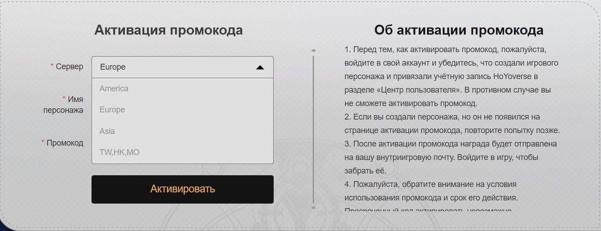 Если вы активируете промокод для Honkai Star Rail через сайт, то потребуется выбрать подходящий сервер. Скорее всего, вы играете на европейском сервере, так что если сомневаетесь, то выбирайте именно его.