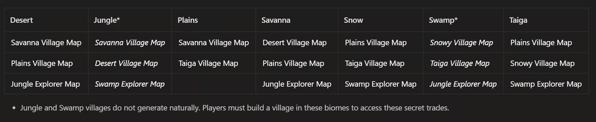 - В продаже у картографов появилось 7 новых кар. Каждая из них приведет игрока к деревне или зданию, расположенных в семи разных биомах.