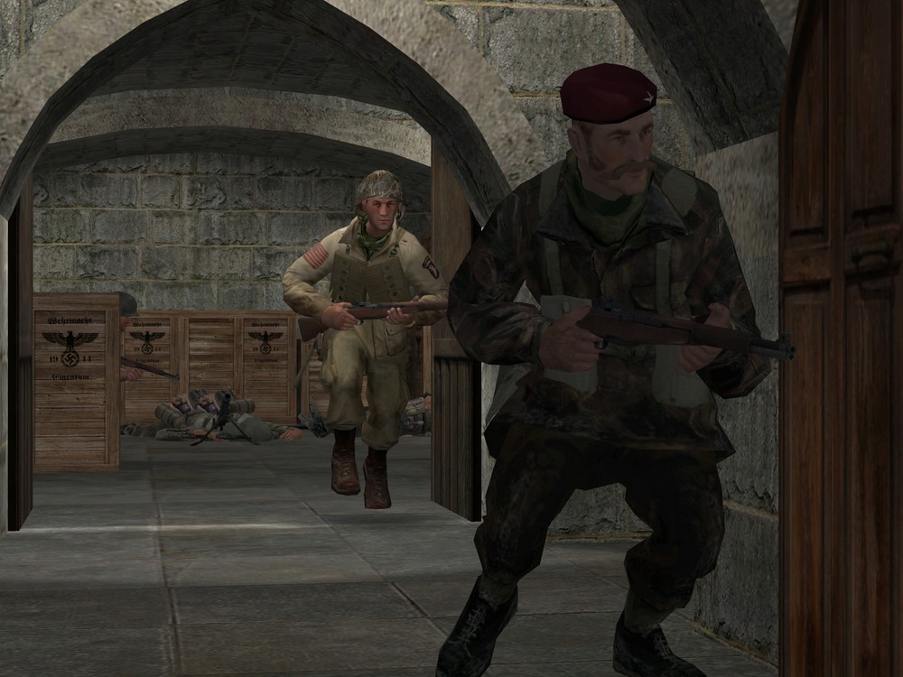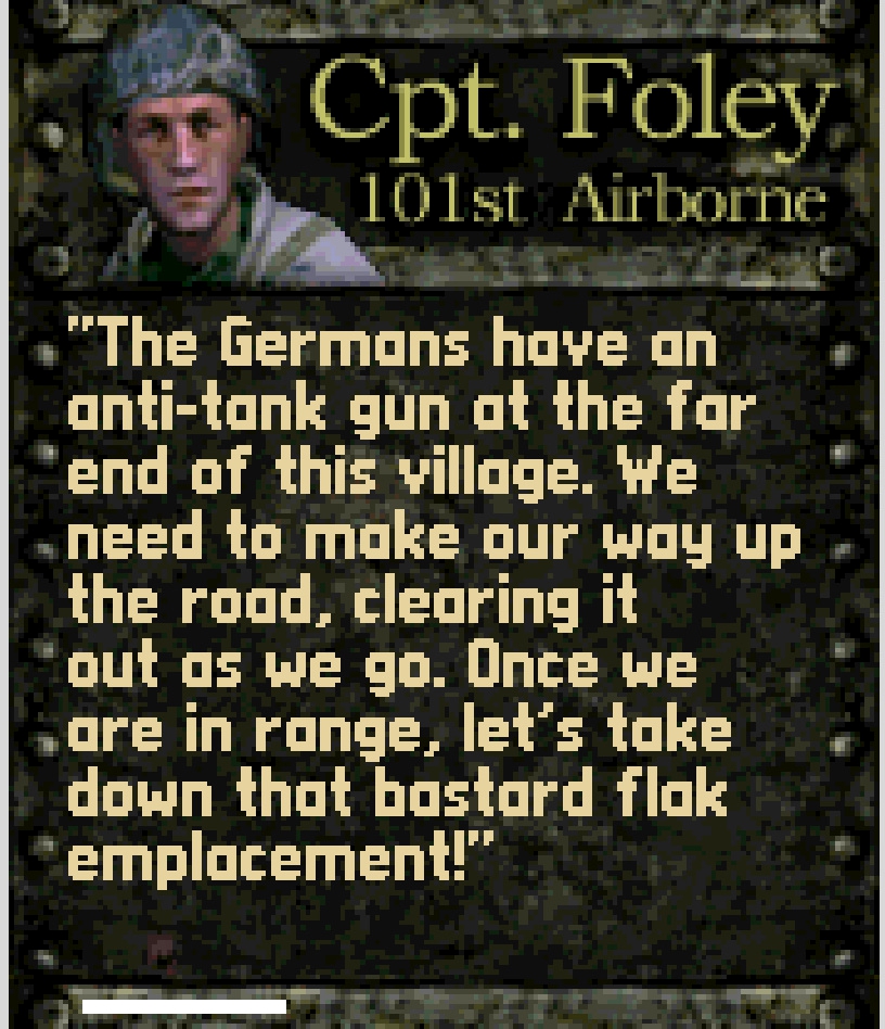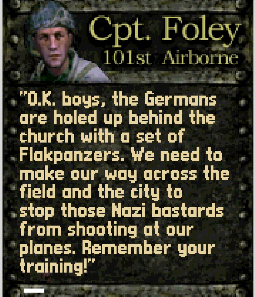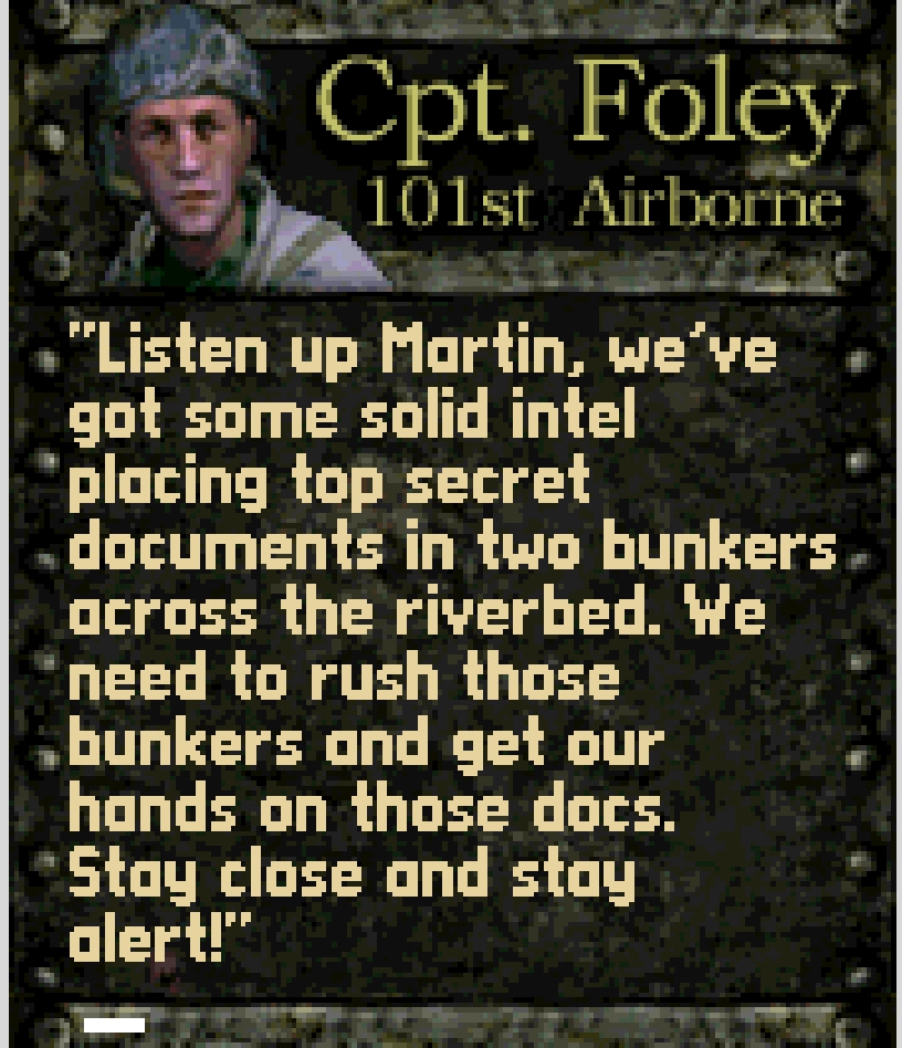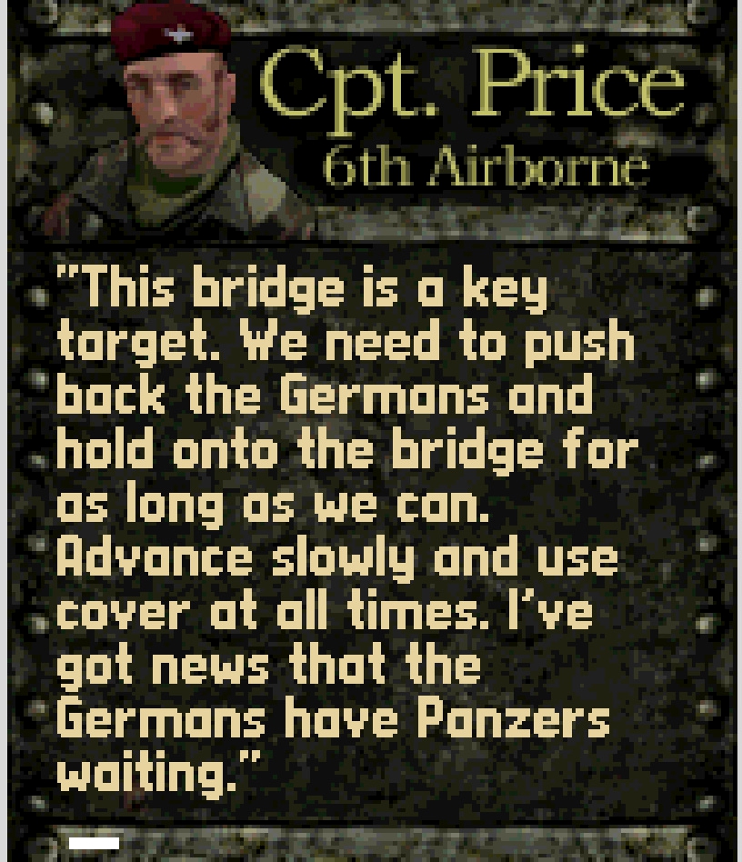 Миссия разделена на два этапа: сначала смотрим на то, как летим к этому мосту ночью, после чего игра уходит в загрузку с оповещением о том, что самолёт сбит. Всё как и в оригинальной игре, только вот приземляемся мы уже днём, но дальше идёт всё как обычно – зачистка территории от солдат с последующей войной против танков. Геометрия уровня более-менее узнаваемая, за исключением моста, который очень уж короткий и выглядит иначе. Танки, из-за дальности прорисовки, видны только когда подъезжают вплотную.