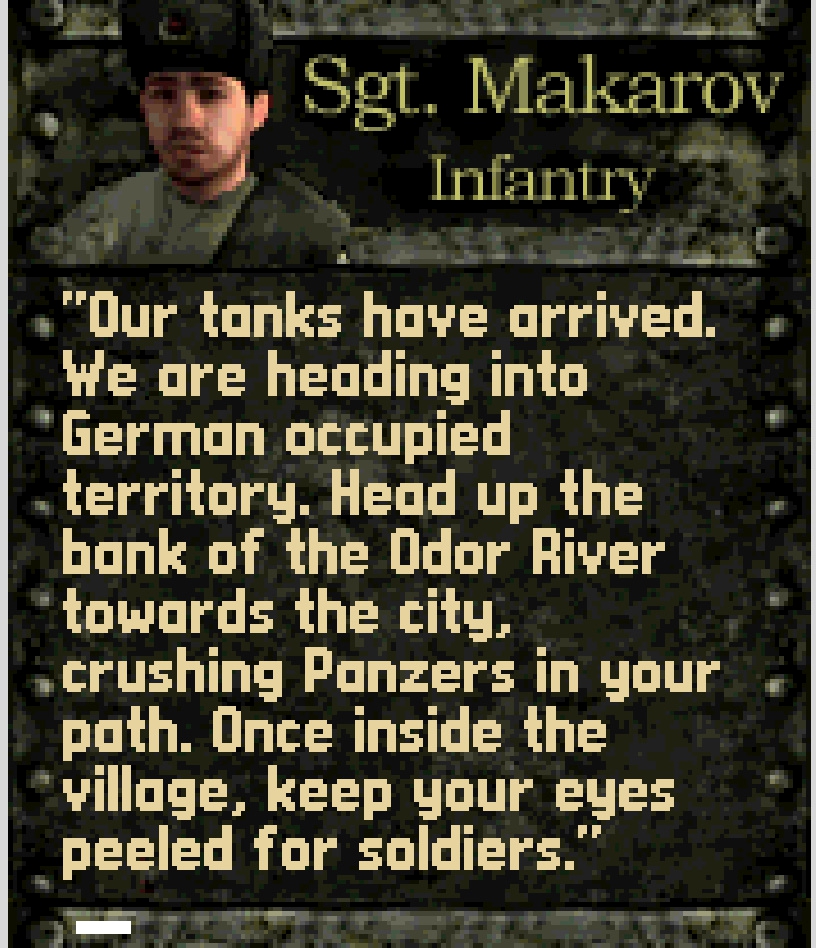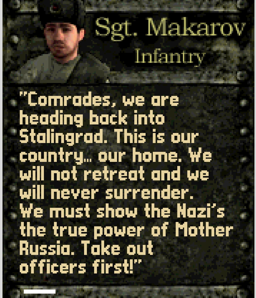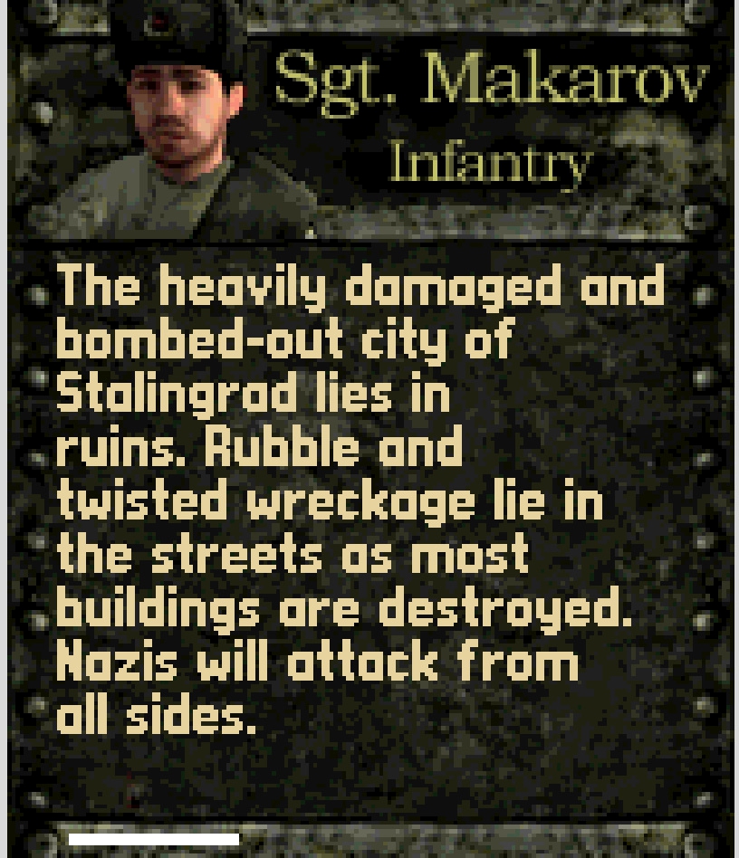 Снова соединение двух миссий в одну. Помните, как начиналась кампания за СССР в оригинальной игре? Плывём, часть товарищей убивают вражеские самолёты, а один пытался дезертировать, за что его убил офицер. Затем, после схода на берег, нам выдавали одну винтовку на четверых и подбирали мы её только тогда, когда товарищ умрёт... Ничего этого в N-Gage нет и мы спокойно доплываем до Сталинграда, не ощутив на себе мощь немецкой армии.