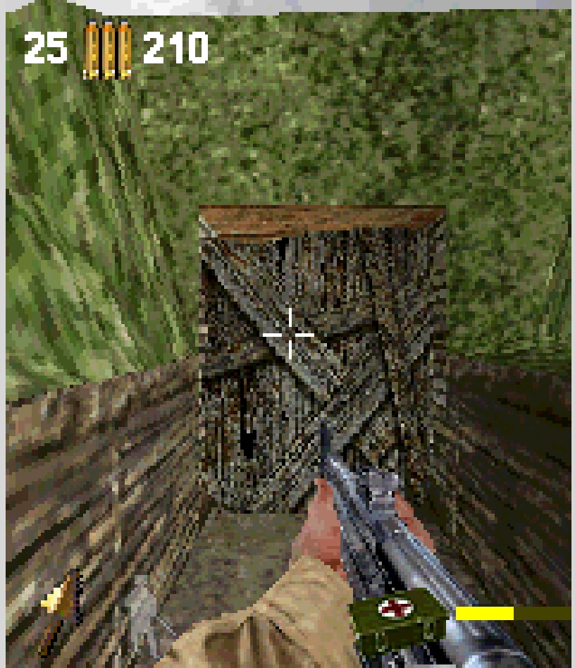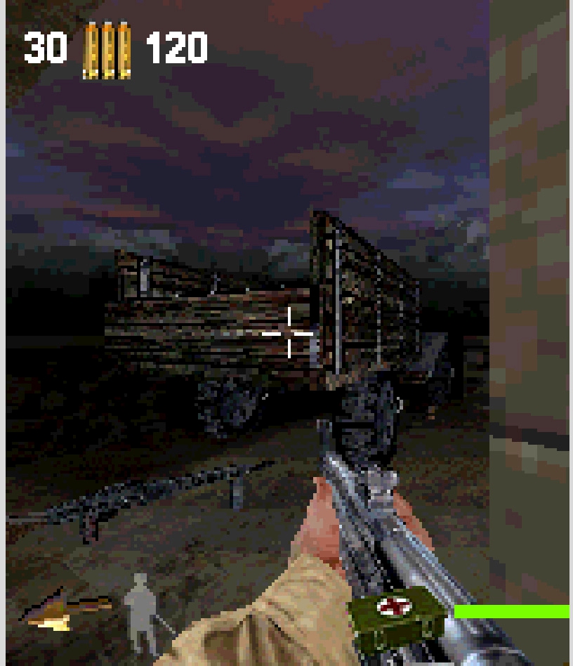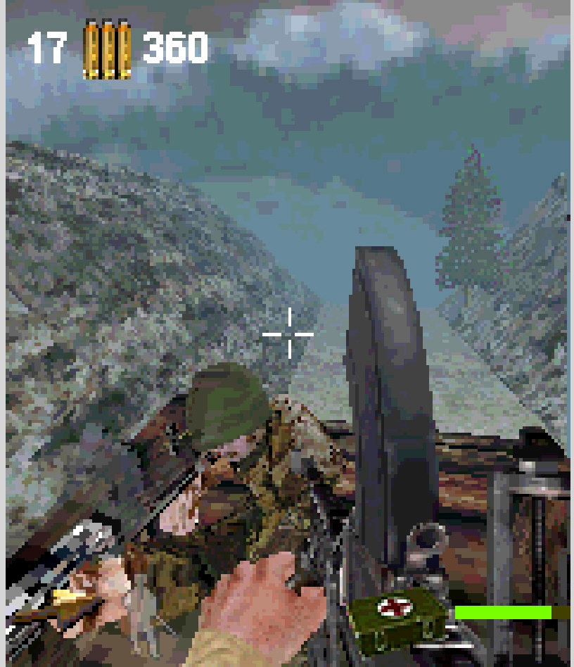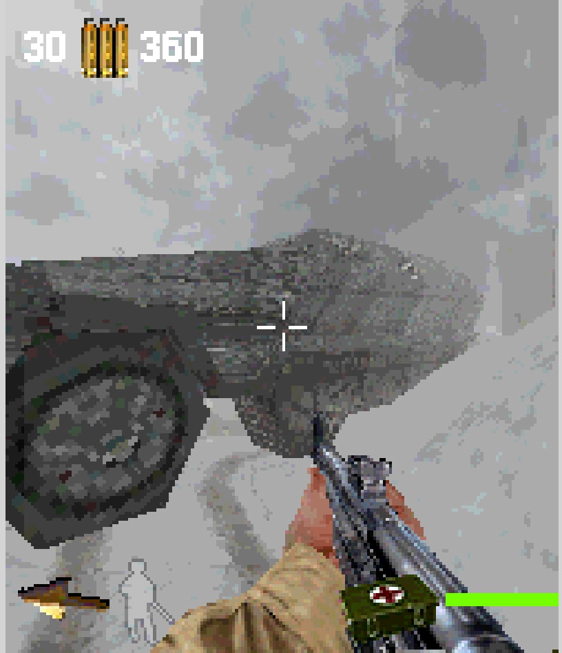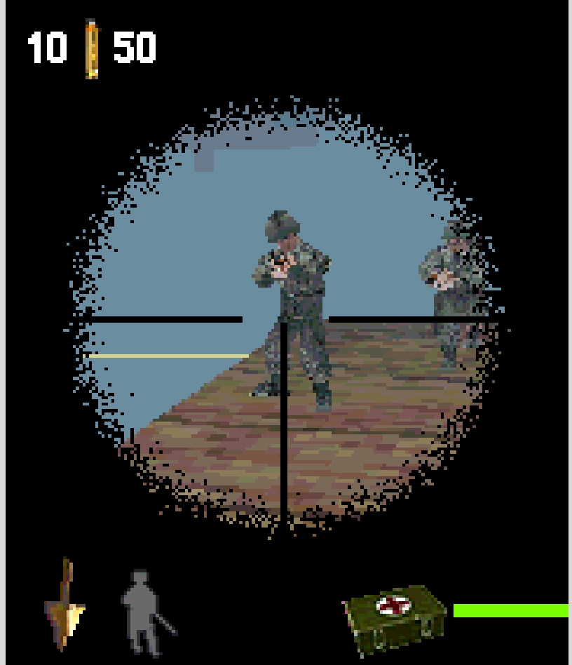 Рано или поздно грузовик останавливается и как в оригинальной игре нам нужно из снайперской винтовки защищать нашего товарища, пока тот минирует деревянный мост. Разумеется, взрыва нам не покажут, да и снайперский прицел нарисован так, будто взяли Paint и спреем попшикали по центру экрана... Зачем так сделано, увы, не ясно.