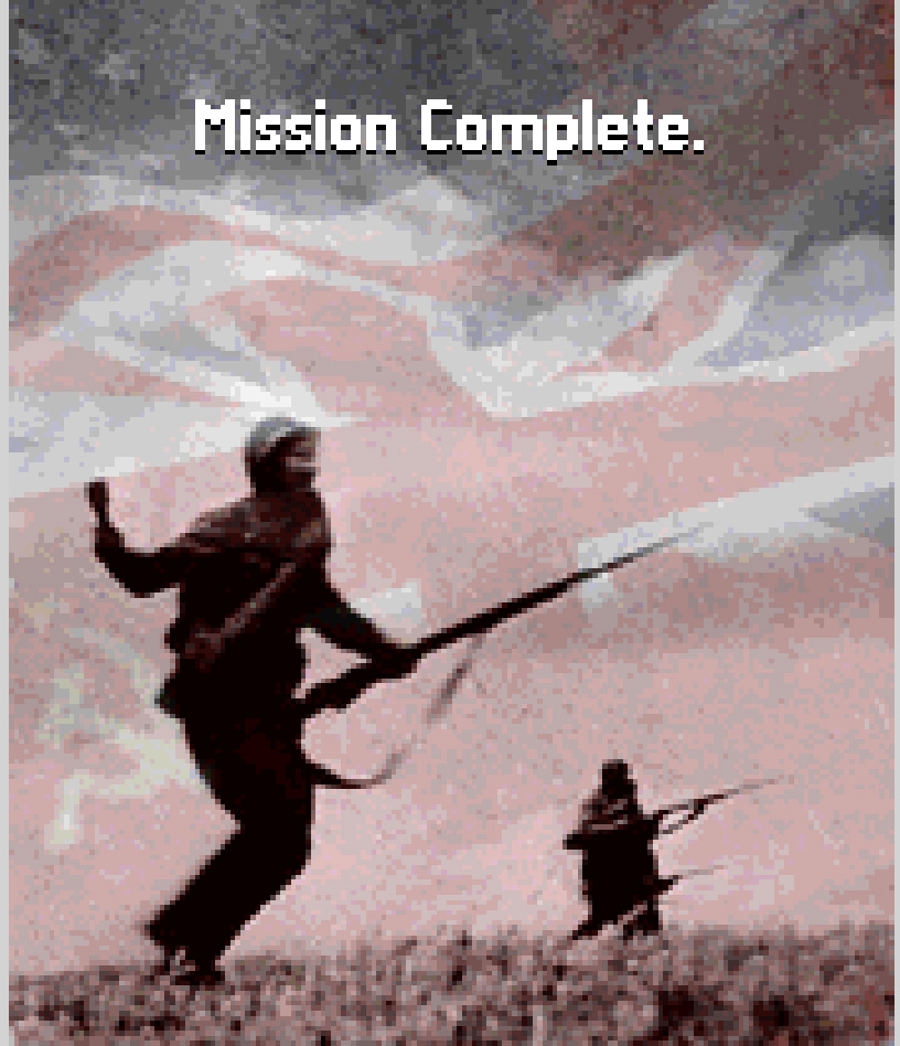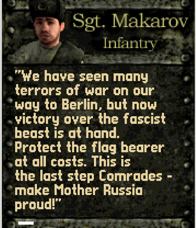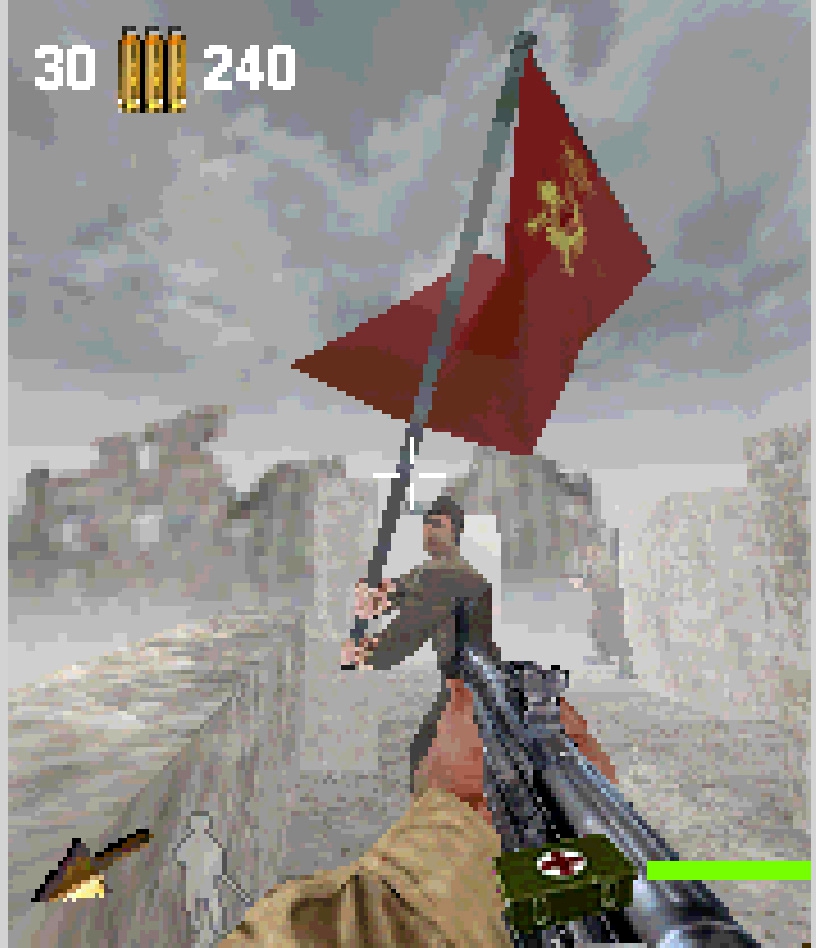 Самый что не на есть финал игры, даже танки и артиллерийские орудия на месте, с пехотой и зданиями, в которых засел противник. Уничтожая всё на своём пути – пробираемся на крышу и развеиваем знамя победы! После поднятия флага СССР – нам показывают фотографии военных лет и титры.