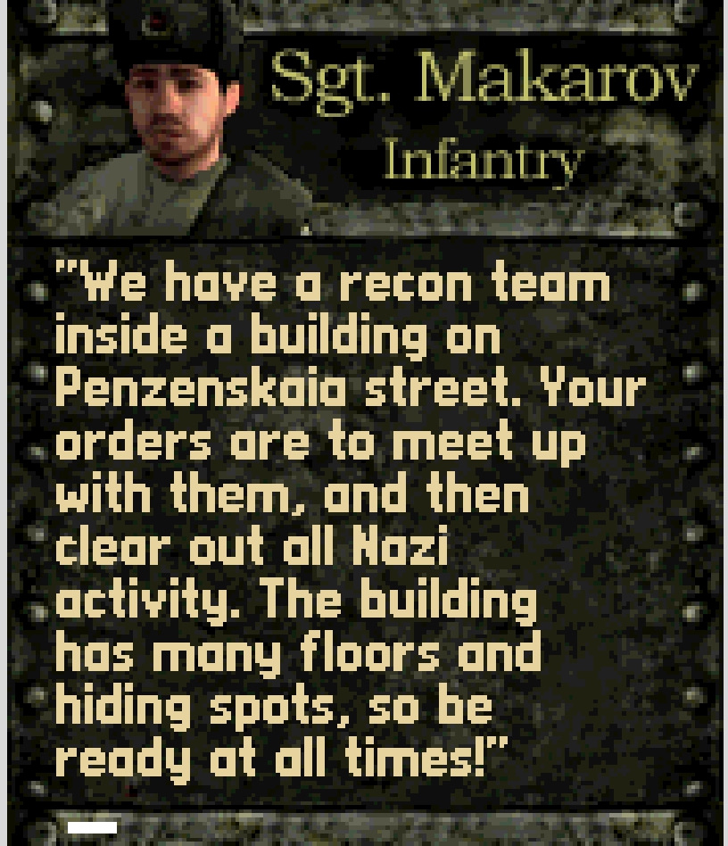 СССР не любили всегда, поэтому большую часть глав за СССР решили спаять в одну. На сей раз это коснулось канализации Сталинграда, в которой немец агитирует сдаваться в PC версии игры, в N-Gage его фраза обрывается на первых двух словах... Видимо, на N-Gage Российским ЗОЛДАТАМ не хотят дать горячую еду и тёплую одежду, а лишь убить и чтобы они страдали... А страдать действительно пришлось, ведь дальше игра из куска говна превращается в неиграбельный кусок говна! Всё дело в доме Павлова, ведь его нужно зачистить... Мало того, что сам дом на N-Gage выглядит странным, у него нет большинства окон, комнат и всего остального, так ещё и игра может заглючить! Задача простая, но если ваш враг респанулся или зашел чуть дальше дома – он упадёт за карту и вы не сможете его убить! Более того, за ним побегут ваши товарищи и на карте останетесь только вы и Макаров... Миссию я не смог пройти, хотя бегал и изучал каждый пиксель карты минут двадцать! В итоге я нашел дыру в карте, понял в чём причина невозможности завершить миссию и просто вернулся в меню, где выбрал следующую миссию.
