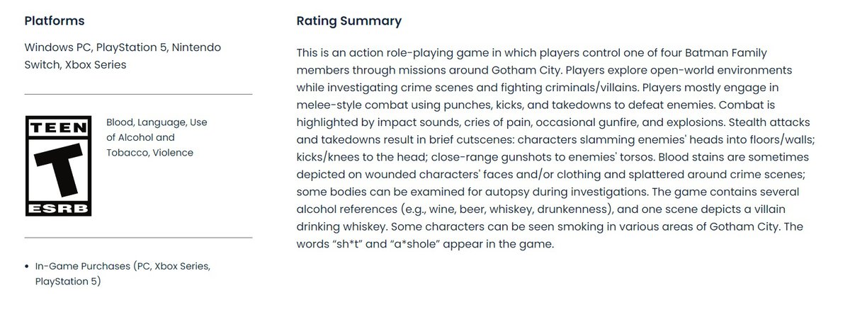 Интересно, что агентства присвоили Gotham Knights разный возрастной рейтинг. ESRB выдало игре мягкий рейтинг T, рейтинговое агентство Сингапура присвоило Gotham Knights рейтинг 16.