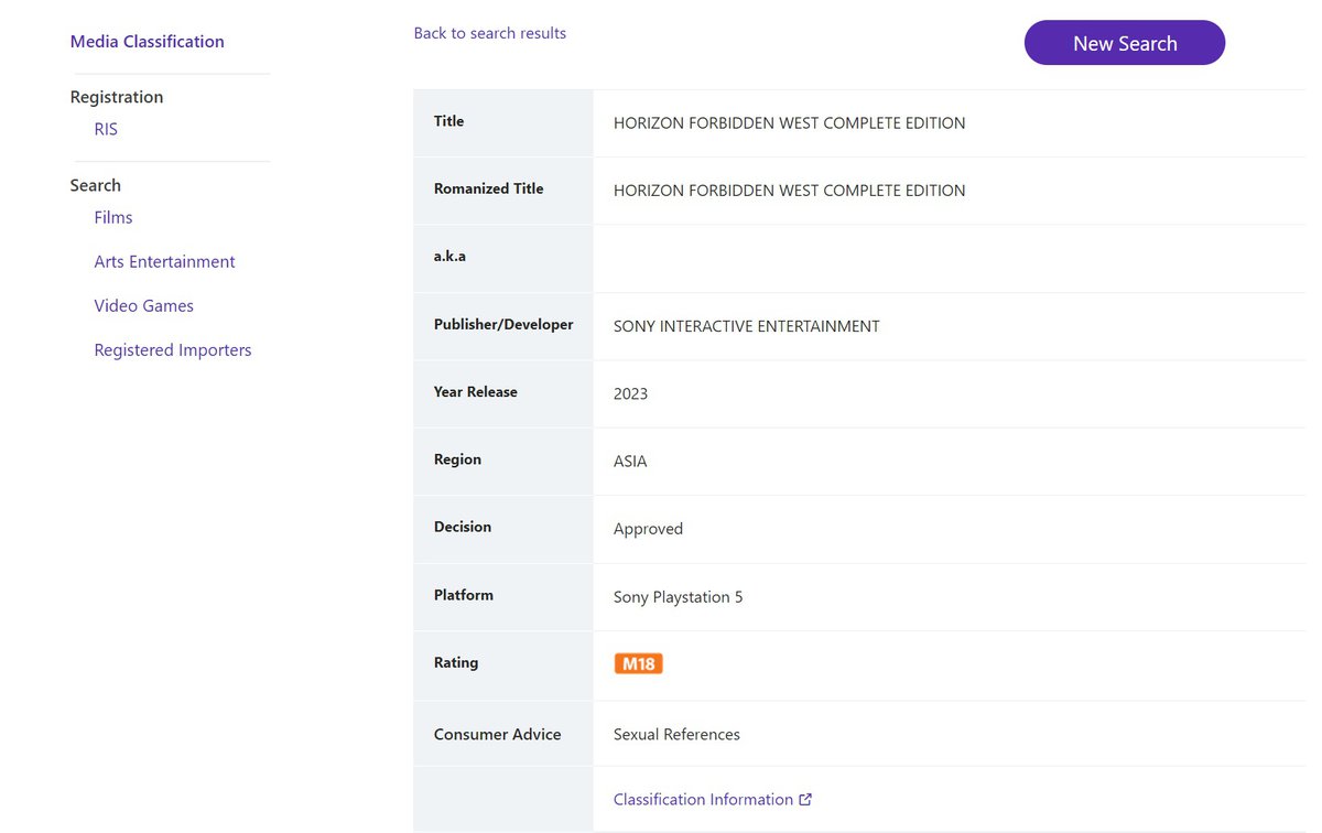 В базе данных рейтингового агентства Сингапура не упоминается дата выхода Horizon Forbidden West Complete Edition. В строке Year Release значится 2023 год, но это может быть и указание на год выхода Burning Shores, последней составляющей части издания.