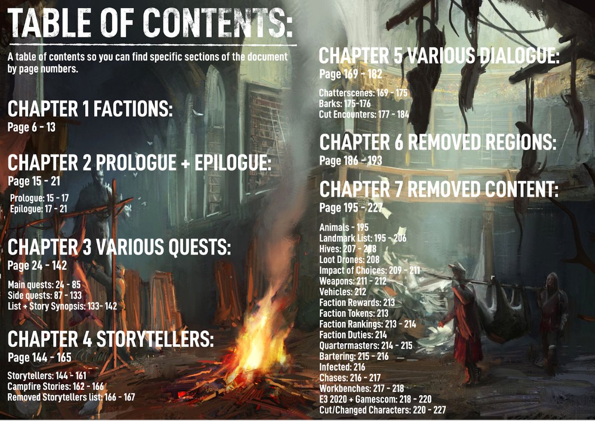 В документе собраны вырезанные задания, фракции и даже регионы игрового мира, от которых по разным причинам было решено отказаться. Оглавление фанатского каталога выглядит довольно внушительно.