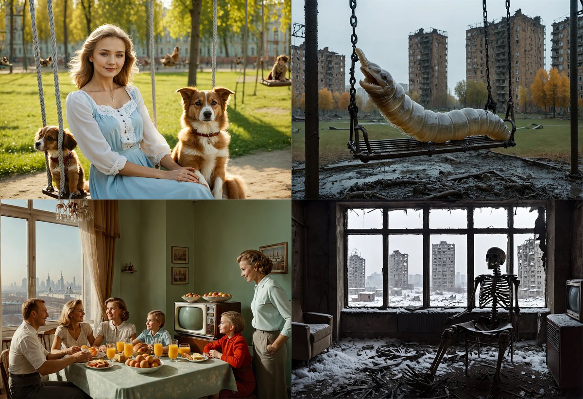 Российский нейросетевой пост-апокалипсис получился довольно затейливым. Например, дети в противогазах соседствуют здесь с оборотнями, многоголовыми летучими мышами огромных размеров и бойцами в шубах, расслабляющихся после трудового дня.