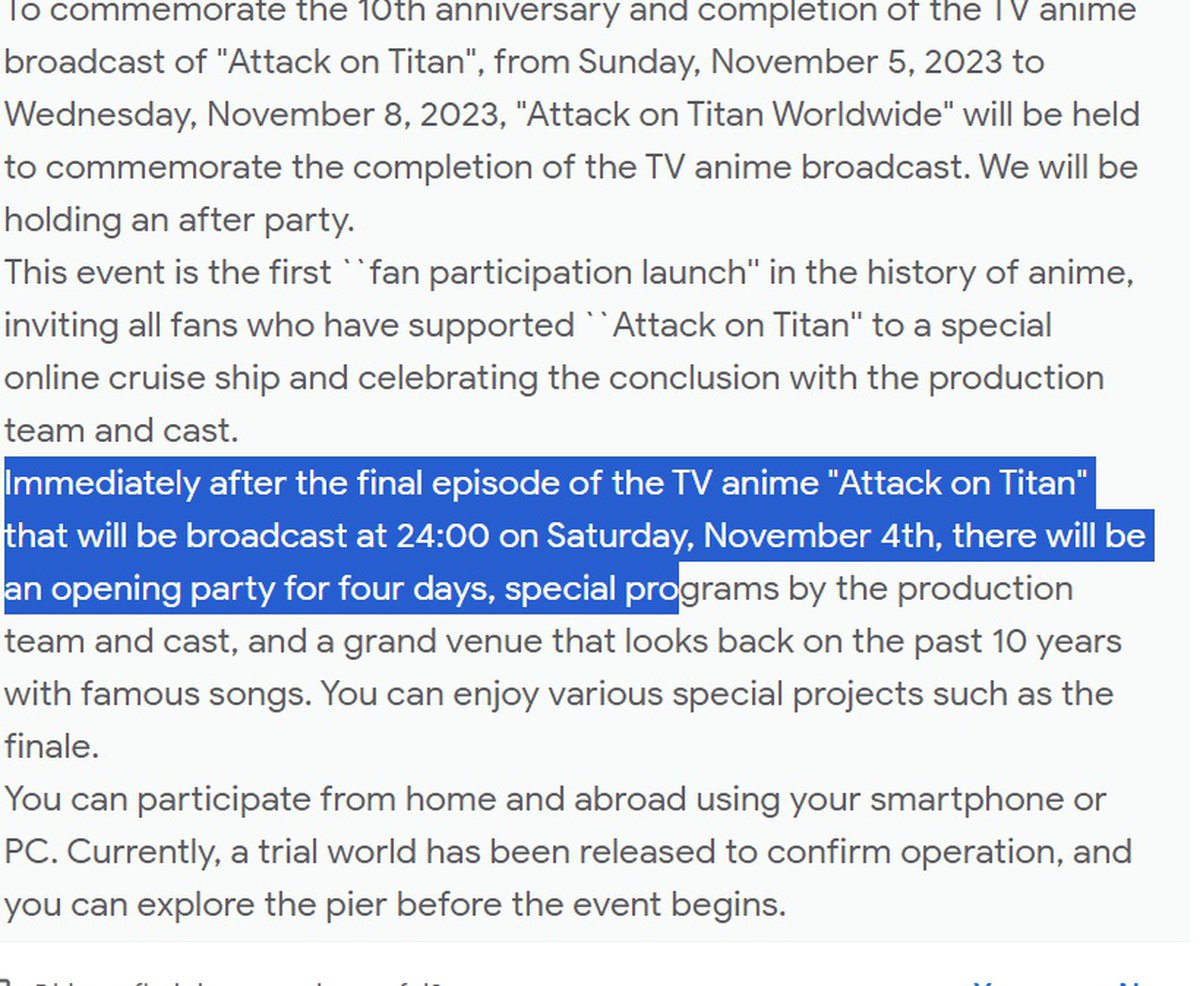 Премьера заключительного эпизода аниме «Атака титанов» может состояться 4 ноября 2023 года. Такая дата упоминалась в описании промо-ролика, посвященного специальной трансляции, стартующей сразу после завершения финального эпизода.