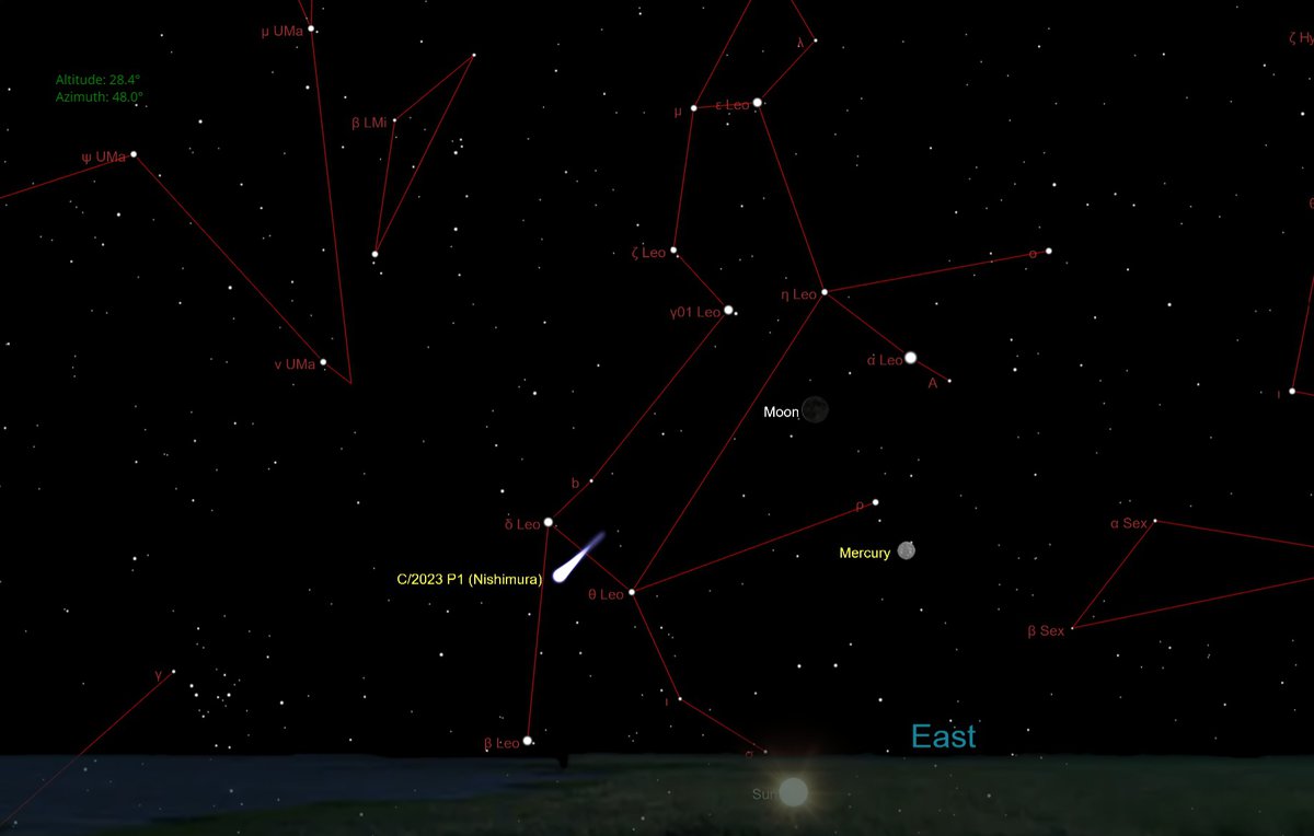 Искать комету следует рядом с созвездием Льва. Для наблюдения потребуется по меньшей мере бинокль, увидеть Нишимуру невооруженным взглядом либо очень сложно, либо просто невозможно.
