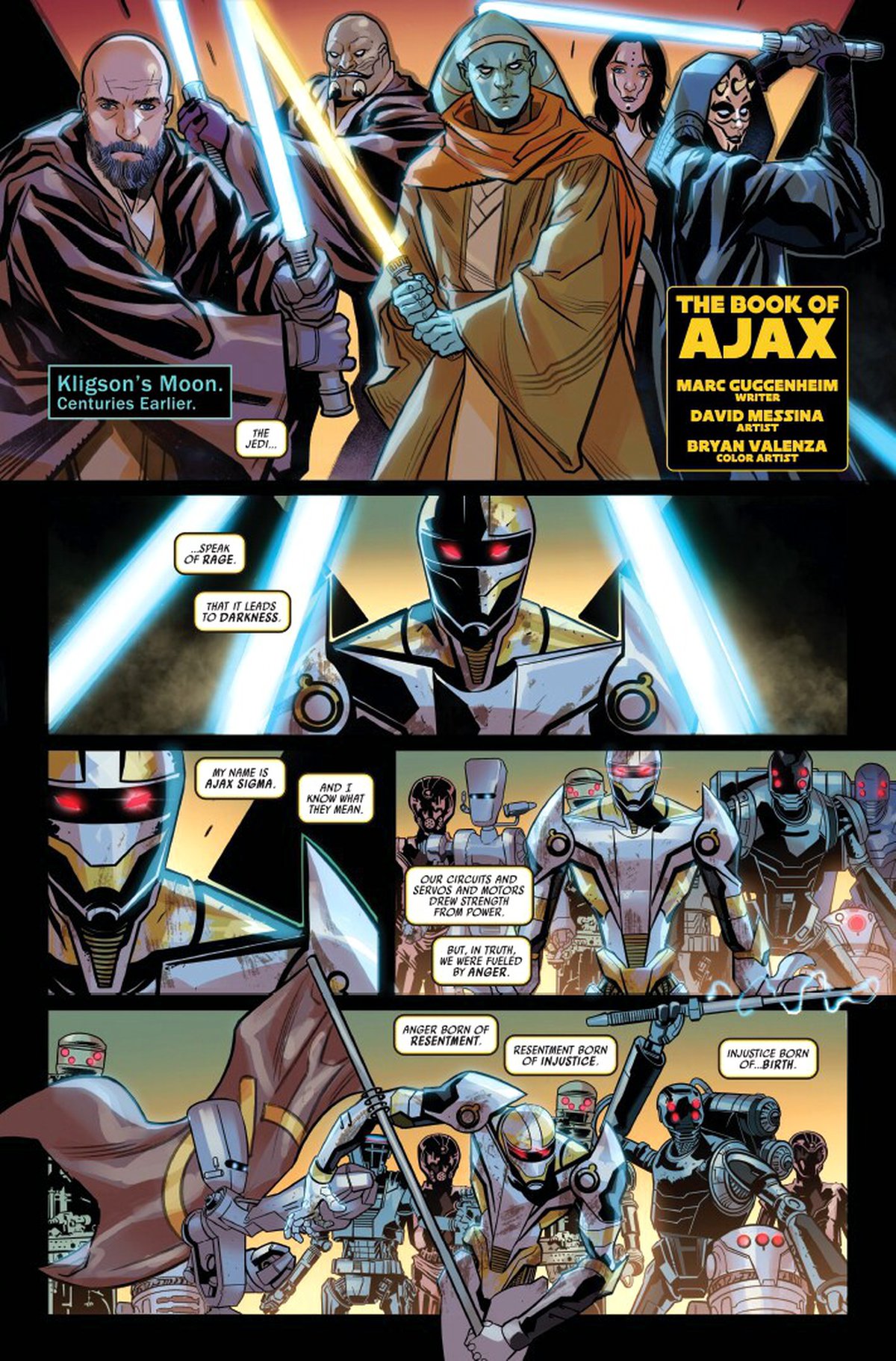 В комиксе будет и дополнительная история, одну её страничку также представили. Там идёт речь про древнее восстание дроидов во времена The High Republic. Сценарист тот же, рисует Дэвид Мессина, красит Брайн Валенза.