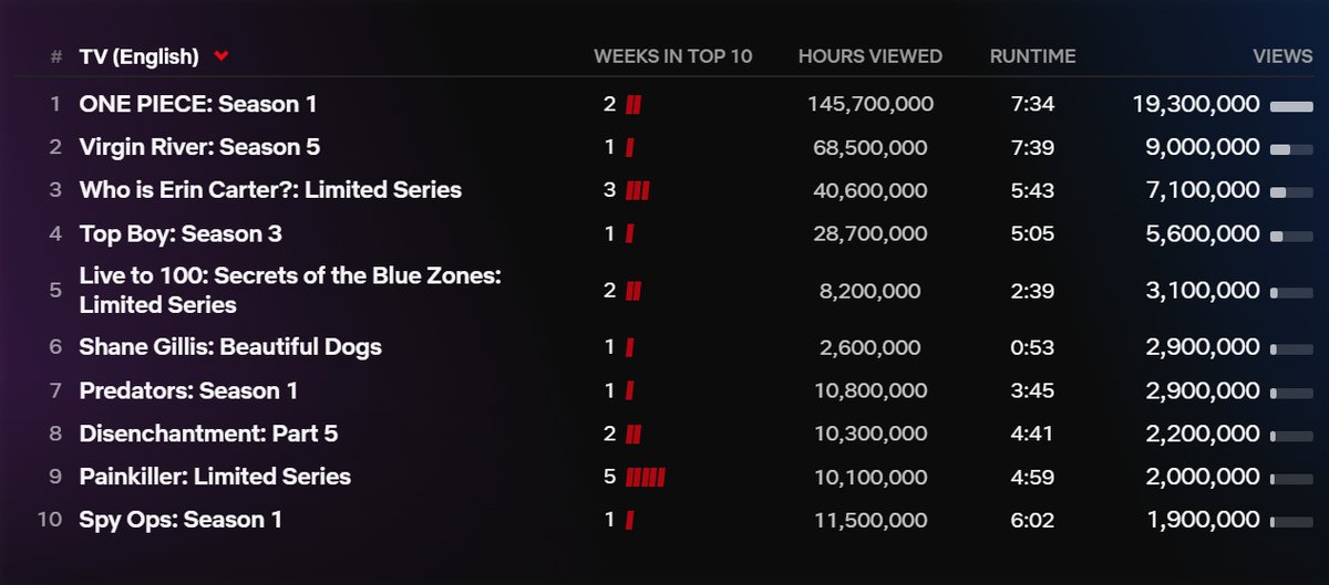 За вторую неделю показа сериал «Ван-Пис» собрал на Netflix 19.3 миллиона просмотров. Пользователи сервиса провели за просмотром шоу 145.7 миллиона часов, это больше, чем в первую неделю премьеры.
