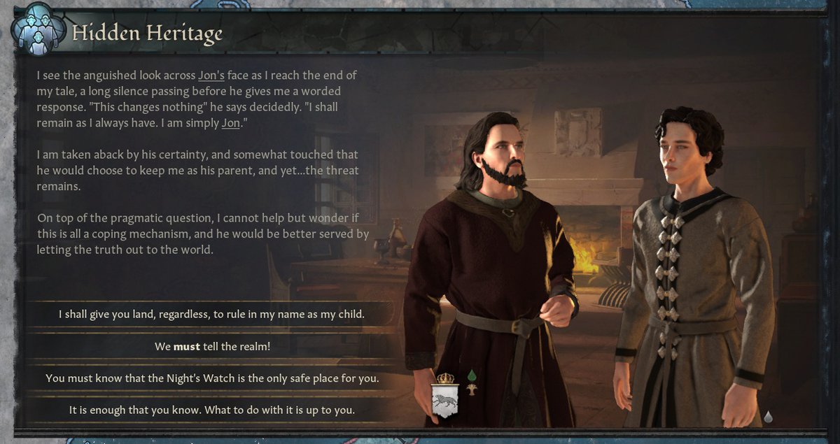 Бастард может отреагировать по-разному. Запросить покровительство у открывшего правду, рассказать всем или ничего. Игрок сможет попробовать и навязать один из этих вариантов.