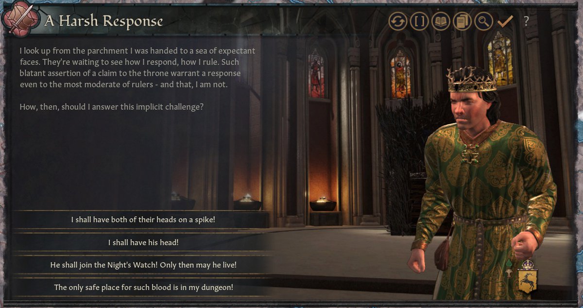 Монарх может захотеть убить не только бастарда, но и его покровителя. Может заставить бастарда присоединиться к Ночному дозору или Молчаливым Сёстрам. В тюрьму посадить тоже вариант. Мирного решения на скриншоте ниже не показано, но по тексту дневника оно тоже есть - попросить отказаться от претензий на трон. В зависимости от личных черт правителя и бастарда, последний даже способен стать советником или придворным.