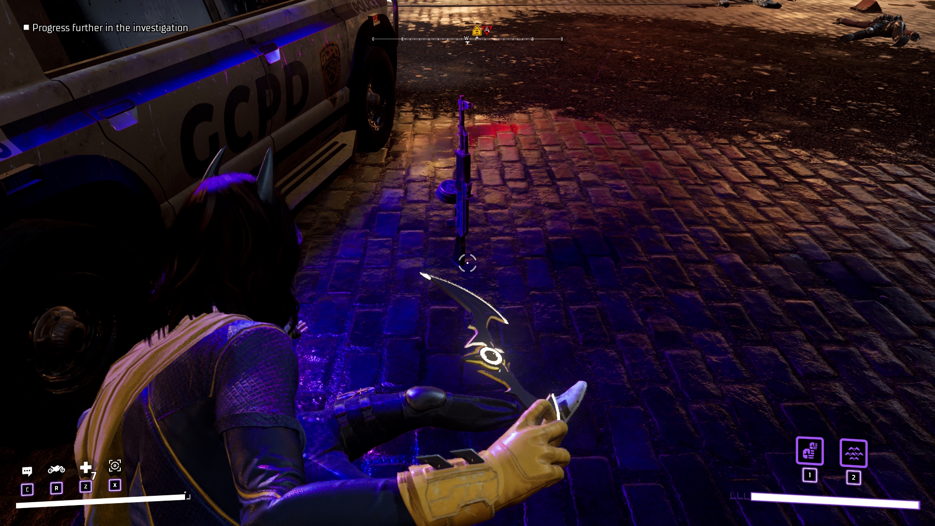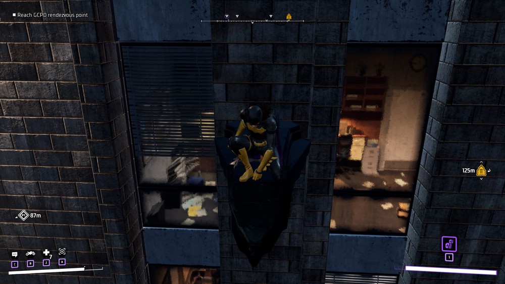 Крафт... Я не знаю, какой дебил додумался в игру про супергероев встроить систему крафта... Но это выглядит странно! Ресурсы мы получаем из раскиданных по городу ящиках, а также избивая врагов и выполняя побочные задания. В целом, обычный гринд, который даёт возможность создать улучшенную версию костюма, оружия и бэтаранга. В то время как у Бэтмена в серии Arkham было обычное снаряжение, которое он не менял всю игру. Все примочки Бэтмена в серии Arkham можно было прокачивать, но не менять. В Gotham Knights же прокачку оружия заменили на крафт нового, с прибамбасами в виде лезвий, а также ядовитого, огненного и замораживающего эффекта. С одной стороны логично, что оружие и костюм изнашиваются и если каждая игра серии Arkham это события максимум одной ночи, то тут у нас несколько дней и ночей.