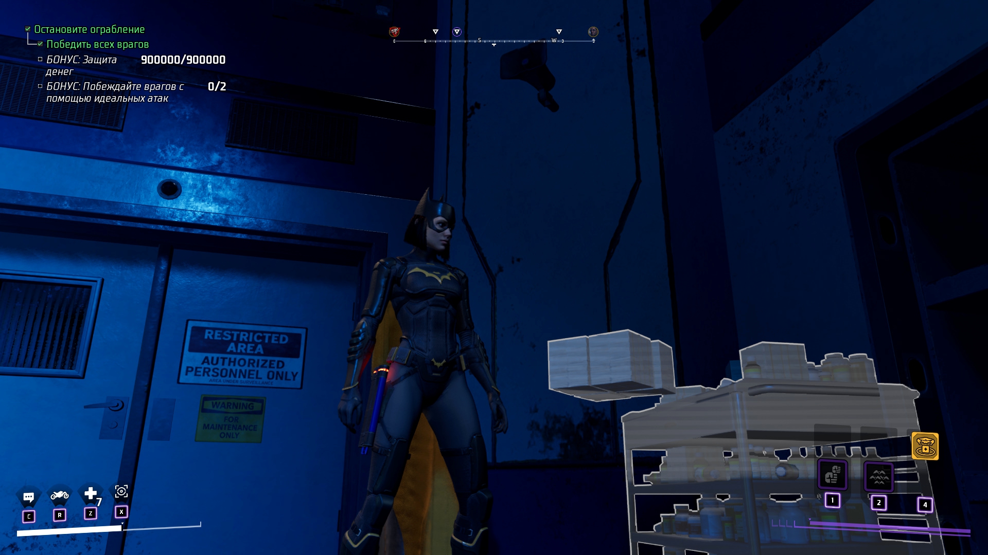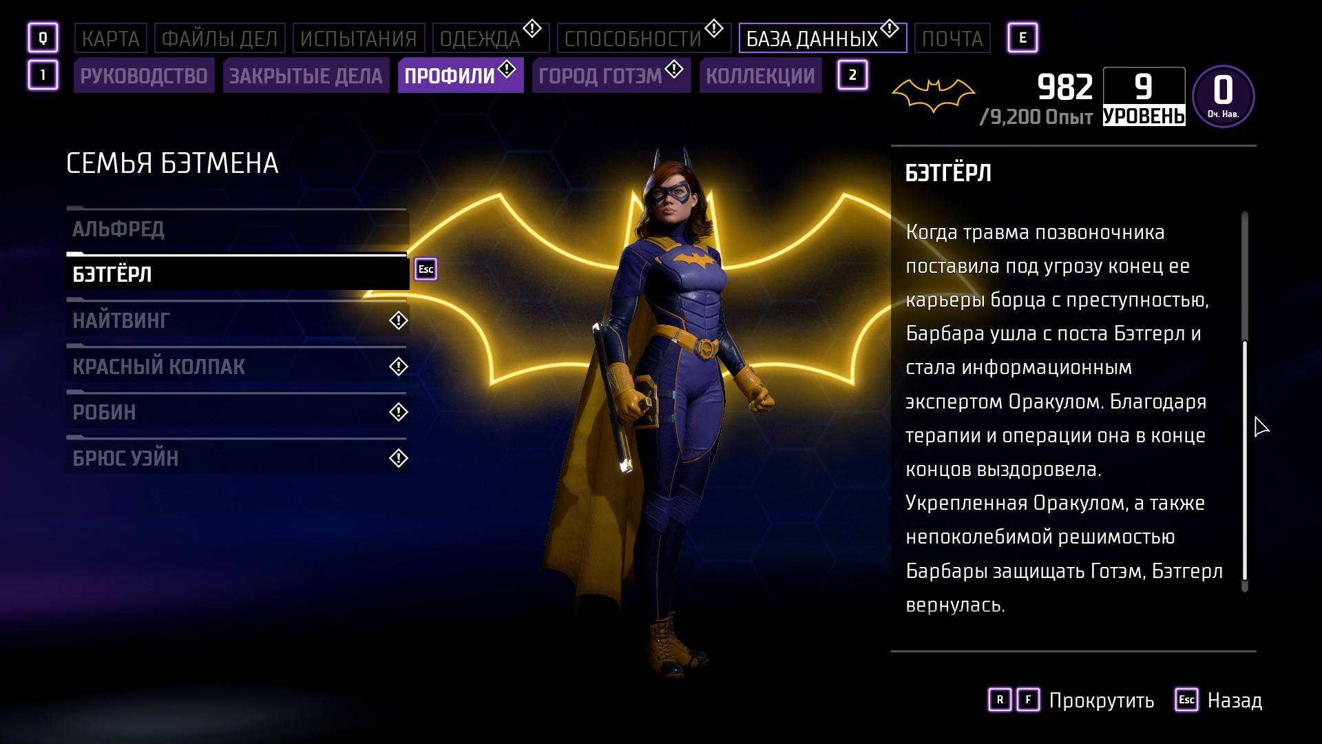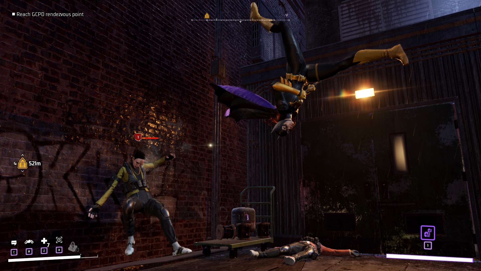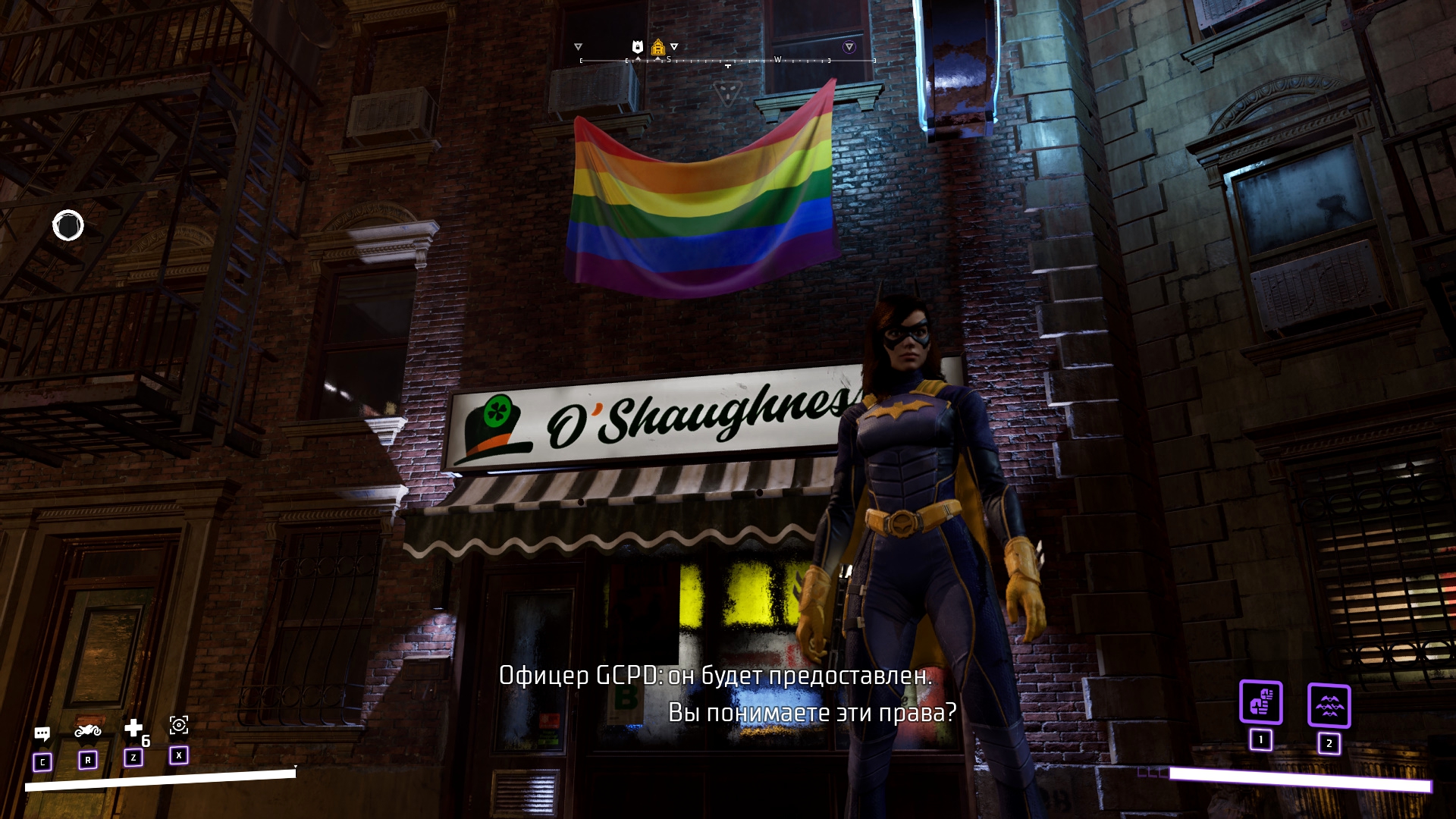 А вот что действительно вызывает вопросы, так это стороны возможностей игры и со стороны сюжета – а почему мы не умеем летать с самого начала? Речь, разумеется, про плащ. Первые пару ночей я летал используя крюк-кошку и ездил на бэтцикле... Я думал, что летать как в серии Arkham нельзя... А оно оказалось, что можно, просто у Барбары, по всей видимости, амнезия и она забыла как это делается... Плащ для полётов может разработать каждый, достаточно: посмотреть на остатки Бэтмена, три раза помычать и потыкать что-то в планшете... Максимально тупо и убого, но функция хотя-бы есть, однако из этого вылетает дыра в сюжете... Игра не связана с Arkham серией, отсюда возникает логичное мнение, что это первые её сподвижки борьбы с преступниками... Но это не так! Не читая шесть комиксов приквелов к игре можно вычитать из биографии Барбары то, что она пережила травму спины и оставила пост Бэтгёрл, после чего ей сделали операцию и из Оракула она снова перешла в ряды борцов. Логично, что Барбару обездвижил Джокер, как это было в комиксе и мультфильме "Убийственная шутка". Более того, поворот с Джокером был также в Batman: Arkham Knight и было бы логично как-то связать игры... Но, об этом чуть позже распишу, а пока что плащ и то, что Бэтгёрл снова учится летать – убогая хрень.