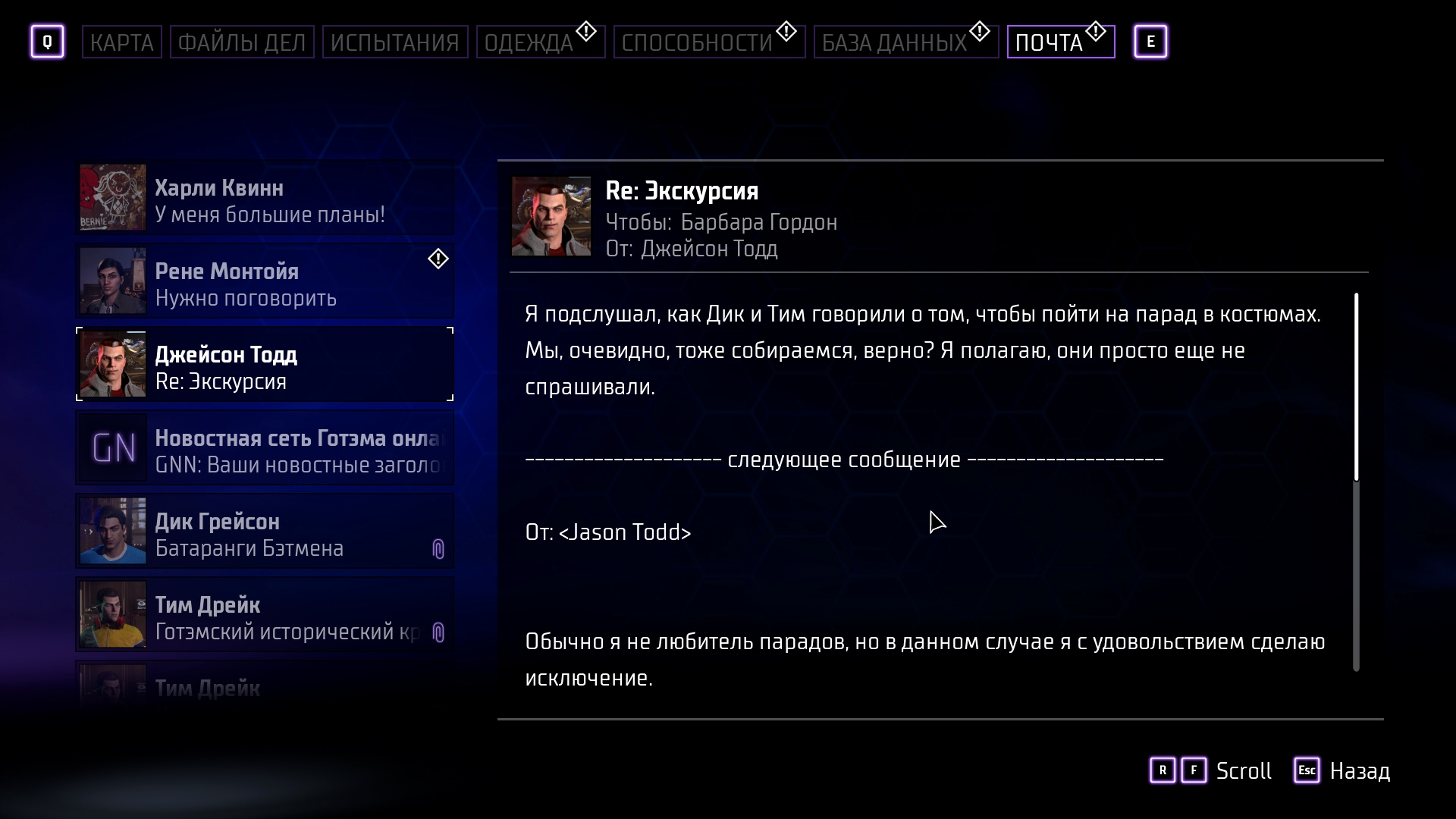 Четвёртое – 80% сюжета игры раскрывается в файлах! CAPCOM со своим Resident Evil задал очень тупую тенденцию – расписывать биографию, значимые события, а также чувства персонажей в файлах... Не читая файлы мы, если не читали комиксы и не смотрели мультики – ничего и никого не поймём! В паре сцен вкидывается одна фраза про прошлое персонажей, но так как это отдельная игра, то восприятие ломается пополам. Нас не освещают про то, как Барбара стала снова бороться с преступностью, как погиб Гордон, как погиб второй Робин и почему он стоит перед нами, что движет Фризом и так далее. Вы только вдумайтесь, такие серьёзные для сюжета детали они запихнули в игру текстом! Это касается не только событий до Gotham Knights, но и во время игры! К примеру, из файликов мы узнаём, что помощник Лэнгстрема умер... Почему это мы узнаём из файлов, когда Лэнгстрем является ключевым героем сюжета – загадка.
