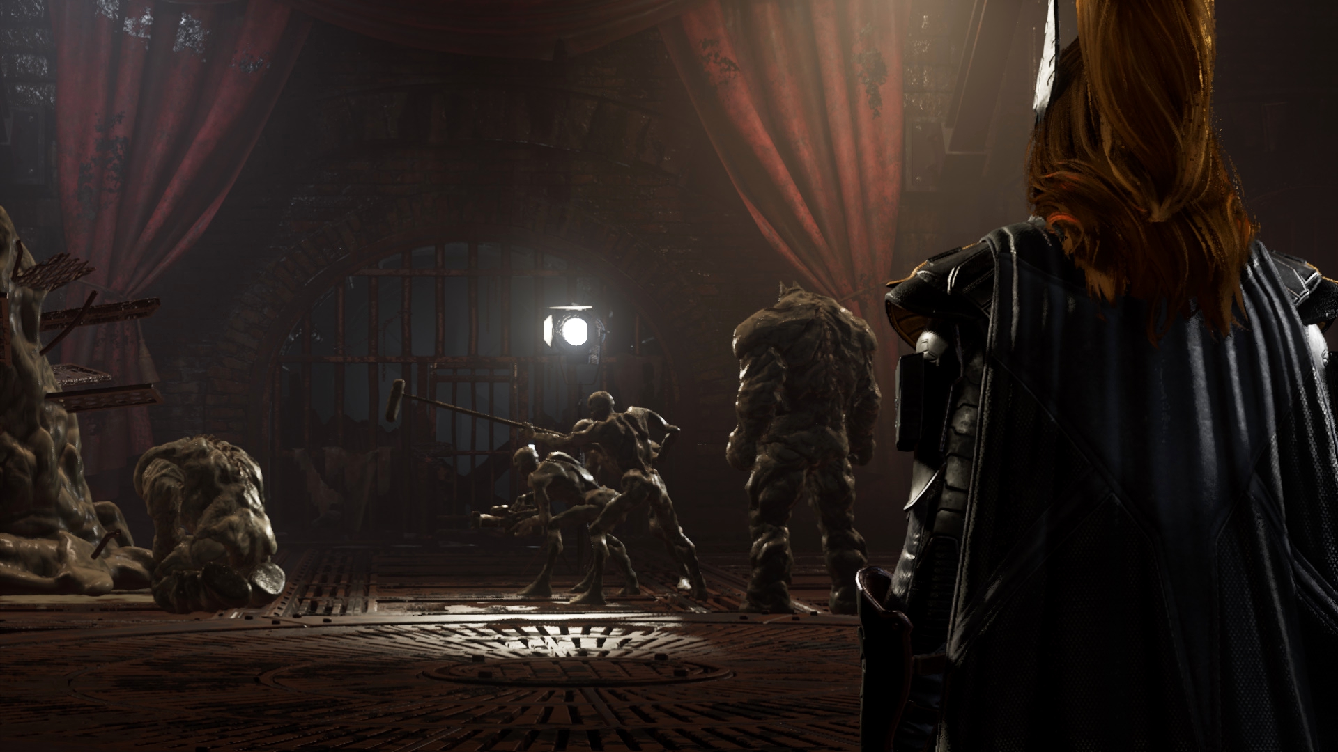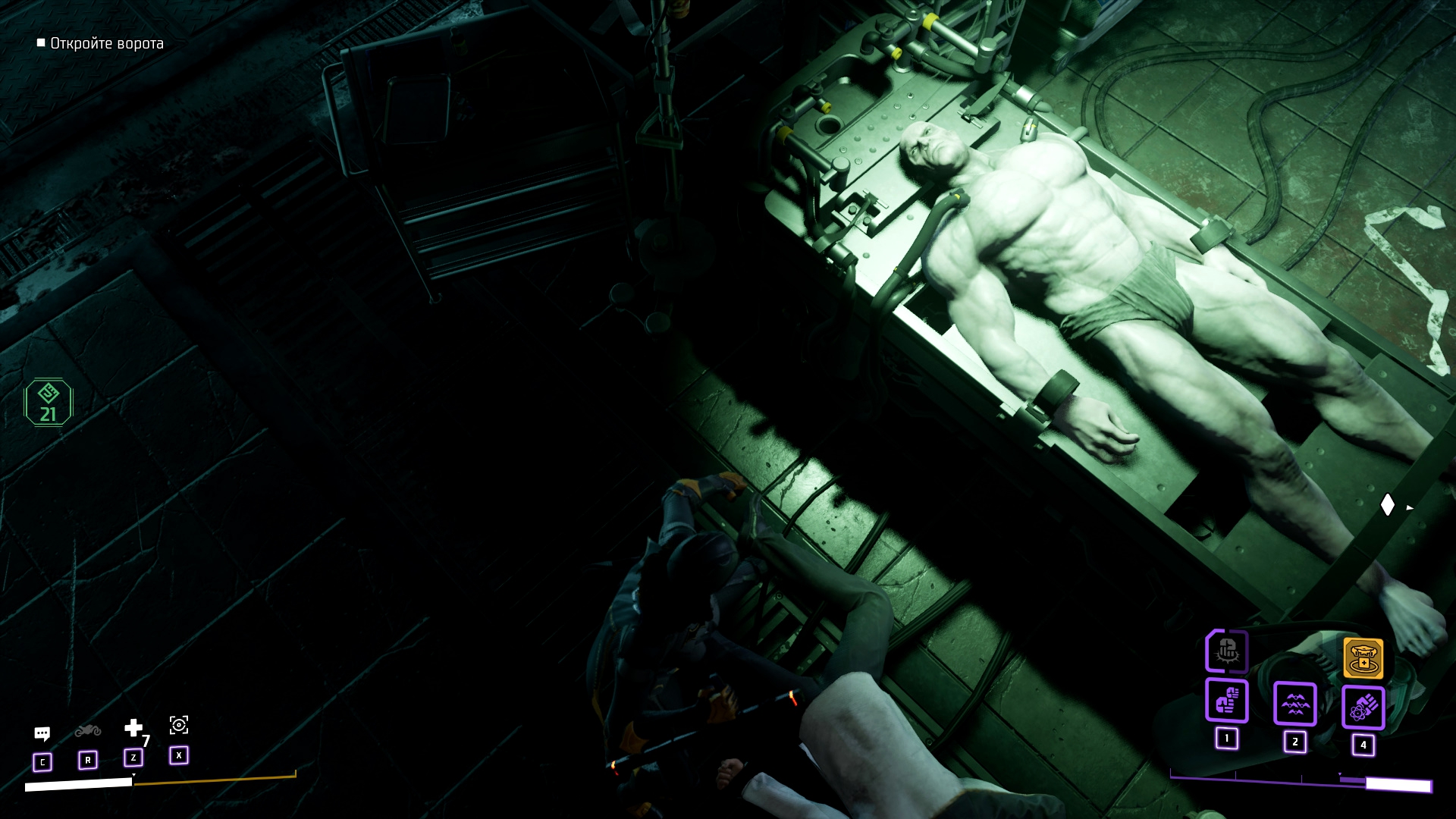 - Момент, когда суд сов всё-таки берёт в плен Бэтгёрл и накачивает газом. После этого момента мы находим лабораторию с сотнями Талонов и встречаем в лаборатории огромных серых дядек, лежачих на операционных столах... Либо я очень соскучился по Resident Evil, либо это на самом деле источник вдохновения, так как лаборатория напоминает Resident Evil 5, а огромный гигачад на столе подозрительно напоминает Тирана из Resident Evil 2 (2019).
