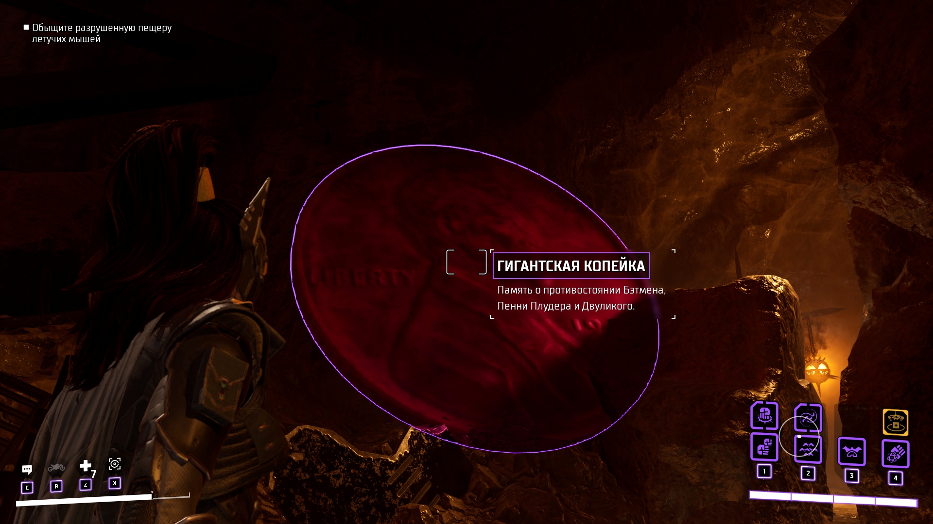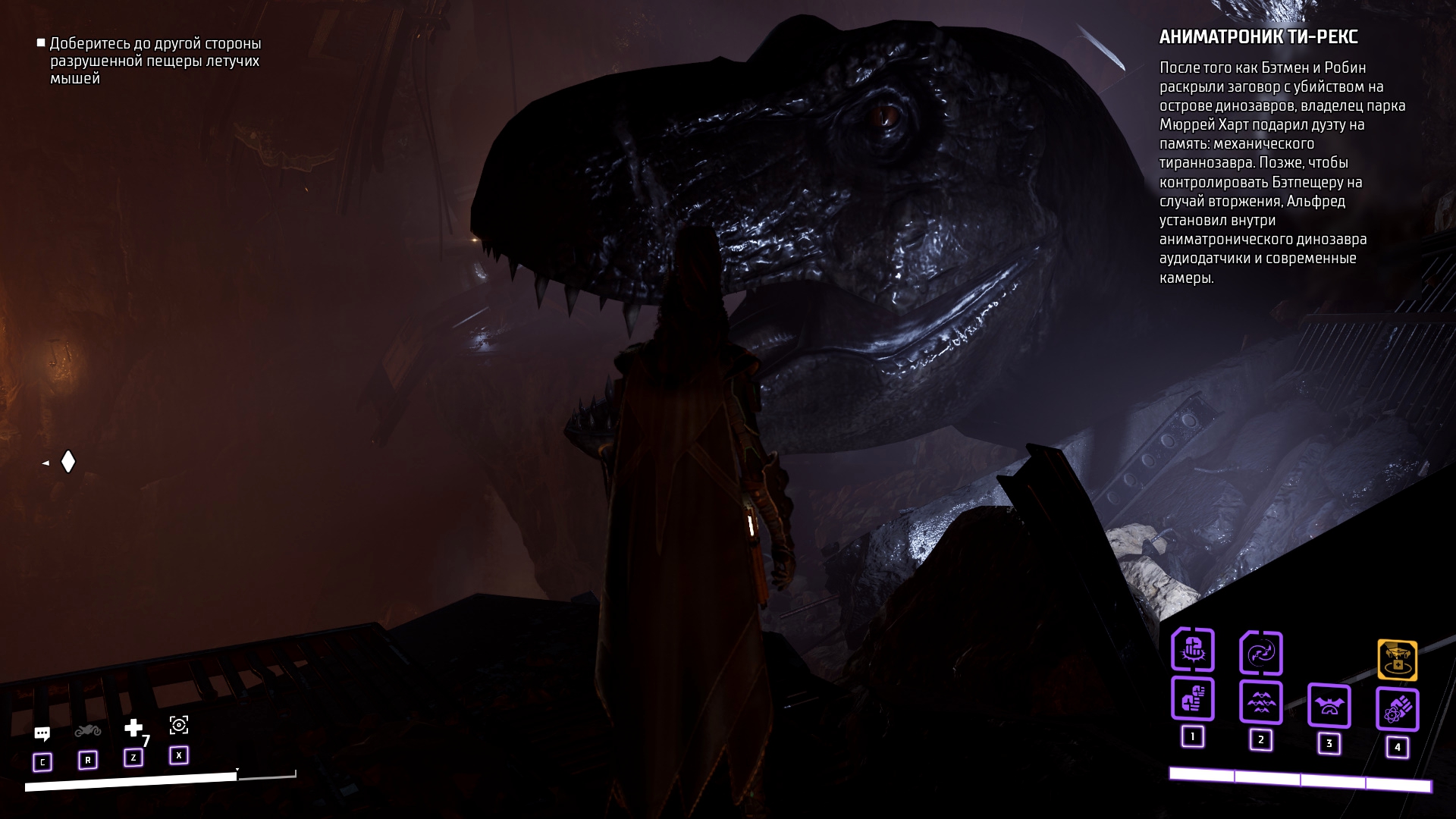 Продвигаясь по пещерам Готэма мы находим ещё одно место из прошлого – бэтпещера. В бэтпещере много всякого того, что нам повествует о событиях, протекающих до игры. Опять же, сюжет многое объясняет конкретно какими-то деталями, которые нужно самим отыскать. Я считаю, что это не совсем правильная подача для супергеройских игр, если это была бы просто отсылка, я ещё бы понял, но не значимые события в истории игры.