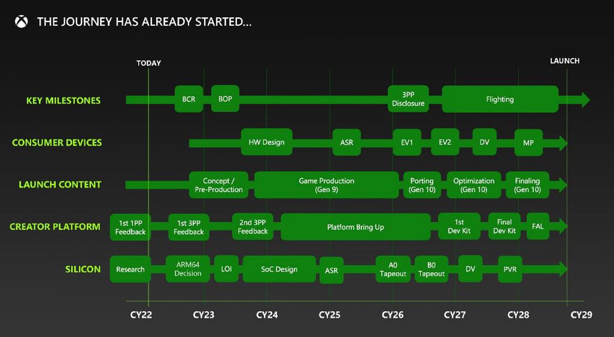 Согласно еще одному слайду, сейчас работа над новой консолью находится на раннем этапе. Если планы не изменились, то Microsoft только-только начинает проектировать чипы для консоли, а первый девкит появится только через несколько лет.