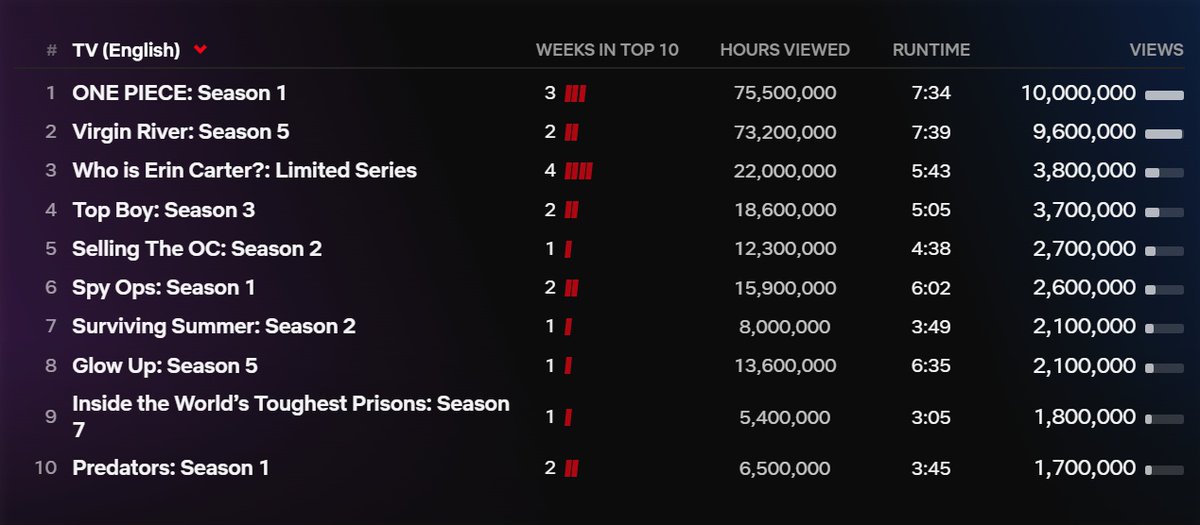 Сервис Netflix составляет глобальный топ по итогам первых 13 недель после премьеры. У «Ван-Пис» впереди еще 10 недель, для попадания в топ-10 шоу надо собирать всего по 3.4 миллиона просмотров в неделю.