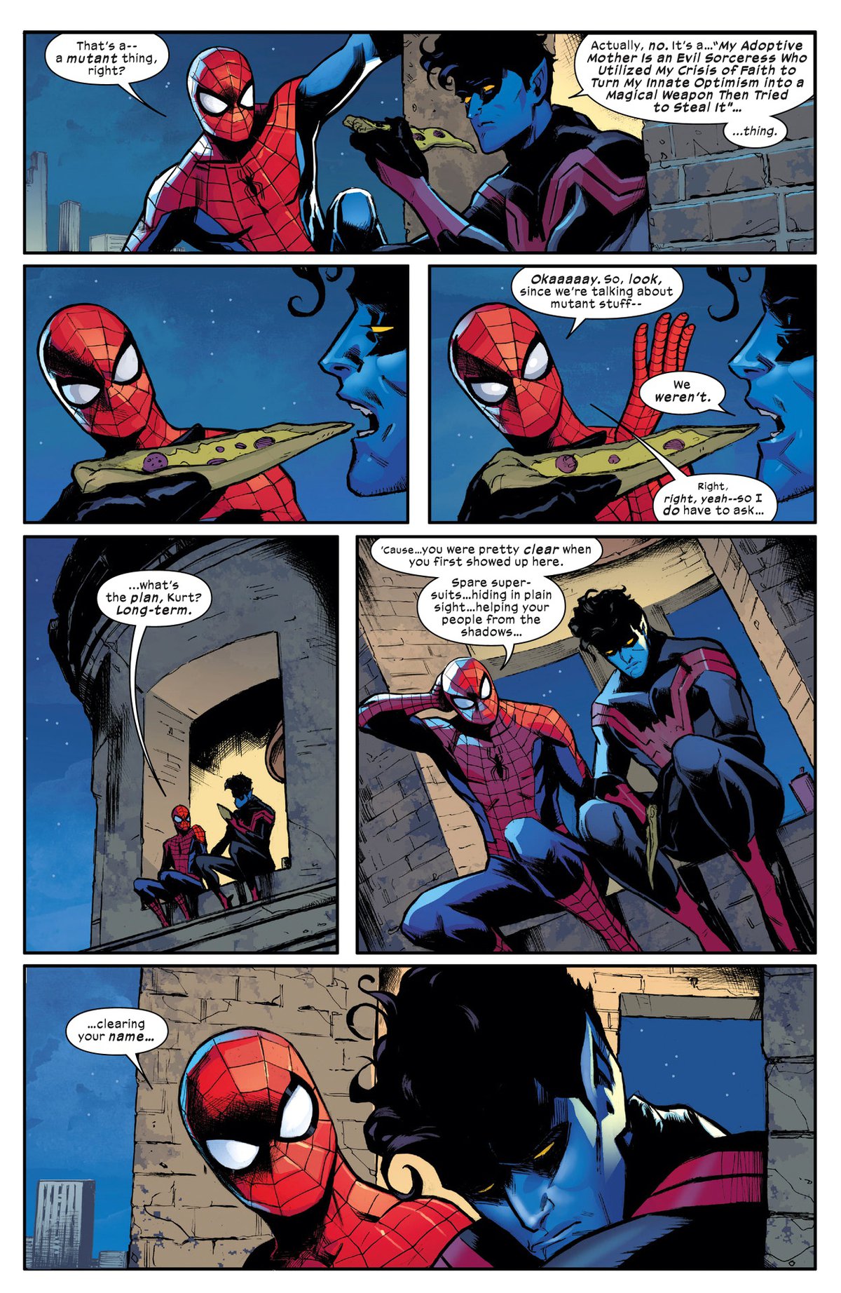 Я думаю, что в контексте Uncanny Spider-Man важно то, что Паркер распознаёт в Курте своего. Спайди признает, что Курт хороший — ему не нужно это доказывать. Что бы ещё мутанты ни сделали, Спайди считает Найткроулера порядочным. Он более чем рад помочь. На самом деле, во всяком случае, Спайди больше хочет, чтобы Найткроулер начал смотреть на большую картину в целом, чем сам Найткроулер. В дальнейшем это вызовет небольшое напряжение.