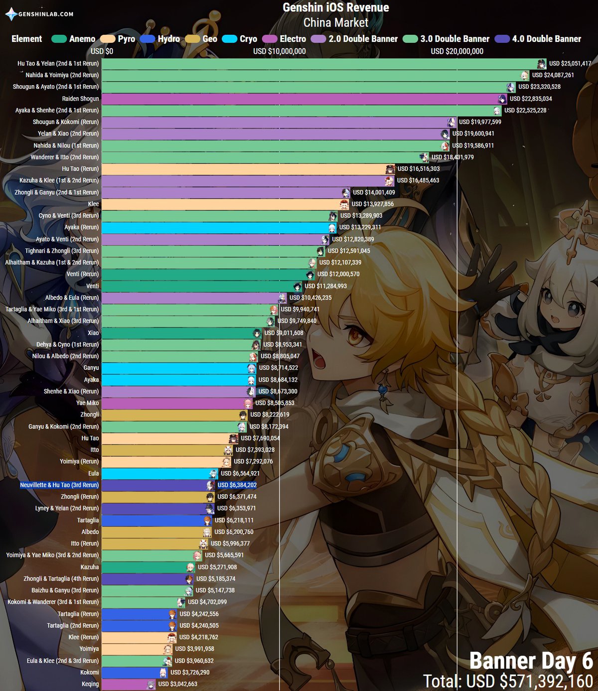 Если ориентироваться на данные по выручке iOS-версии Genshin Impact в Китае, то окажется, что новый баннер стартует на уровне первого баннера обновления 4.0 с Лини и Е Лань. Разрыв в выручке можно назвать минимальным: