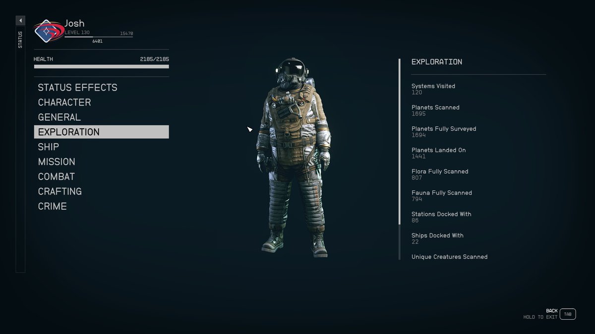 Судя по скриншоту, опубликованному энтузиастом, он побывал в 120 звездных систем и просканировал 1695 планет. Игрок сумел высадиться на поверхность 1441 планеты.