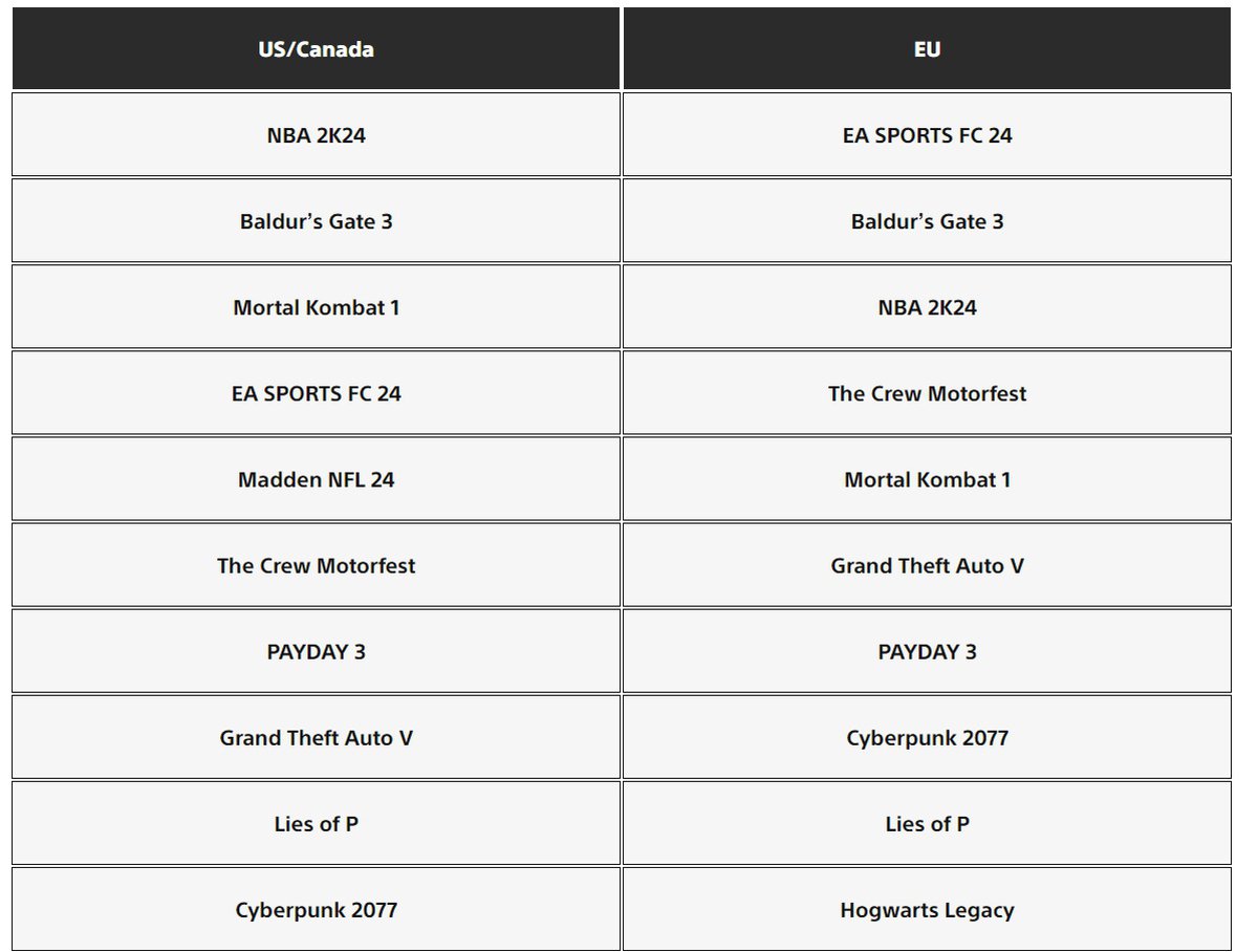 Игровое подразделение Sony опубликовало списки игр, пользовавшихся наибольшей популярностью у владельцев PlayStation в сентябре 2023 года. В этом месяце на PlayStation вышла ролевая игра Baldur's Gate 3, пользовавшаяся большим успехом на PC; возглавить консольный топ она не сумела.