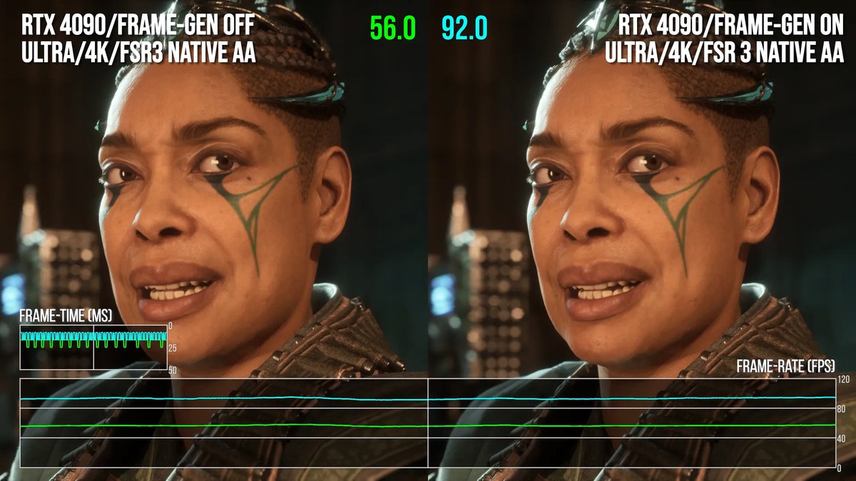 - Сама генерация кадров работает очень хорошо: частота кадров может увеличиваться на 70%, при этом сгенерированные кадры выглядят вполне прилично.
