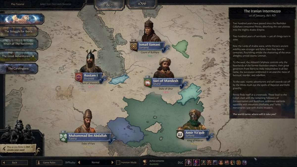 Помимо этого, были представлены новые стартовые персонажи для 867 года. Рустам I - последний Сасанид, Мухаммад ибн Тахир - преданный сторонник халифа, Исмаил Самани прямо с современной денежной валюты Таджикистана, Сури из ещё одной таджикской династии - Гуридов - расположился между землями с исламом и буддизмом, Амир ибн Якуб вылезший из простолюдинов в правители иранский народный герой.