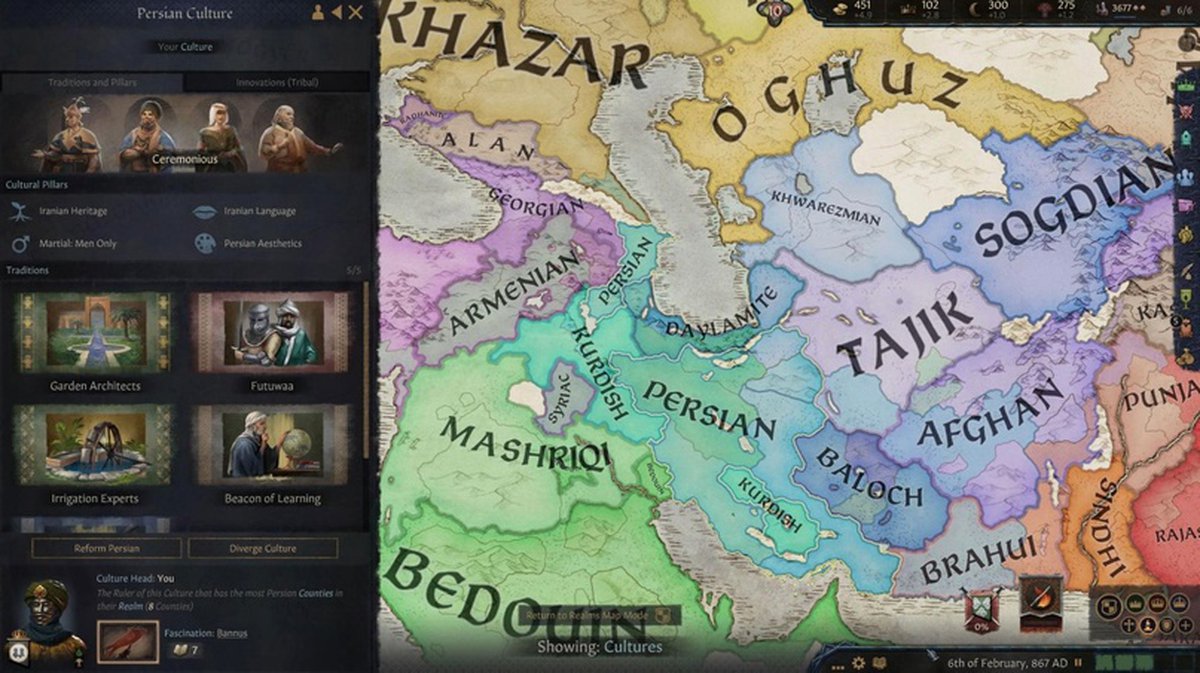Кое-что раскрыли про культуры. Курды получат традицию с горной кавалерией, дейлемиты с вооружёнными двузубчатыми копьями наёмниками, персы со знаменитыми научными изысканиями персов и сложными системами охлаждения воды и орошения.