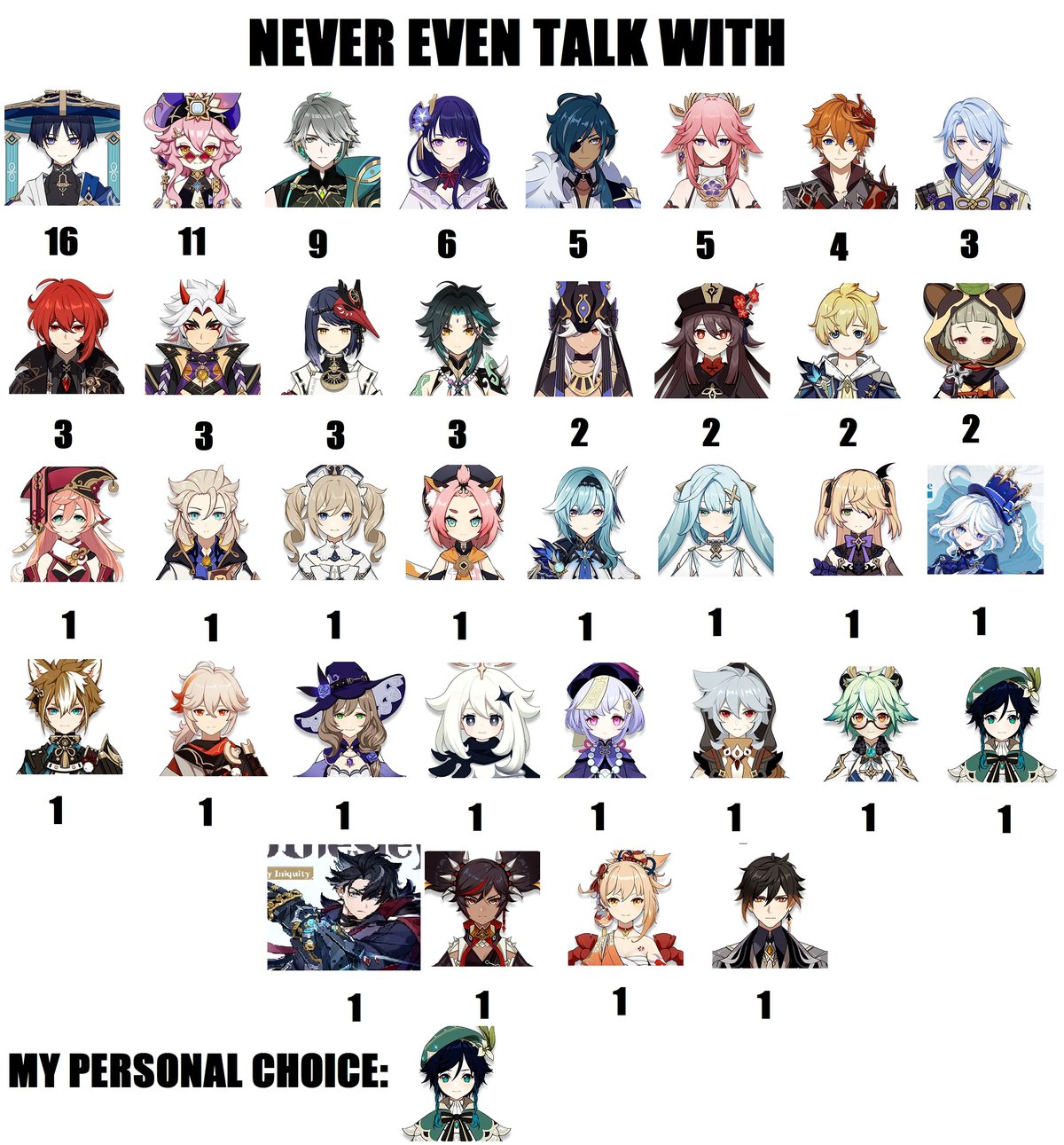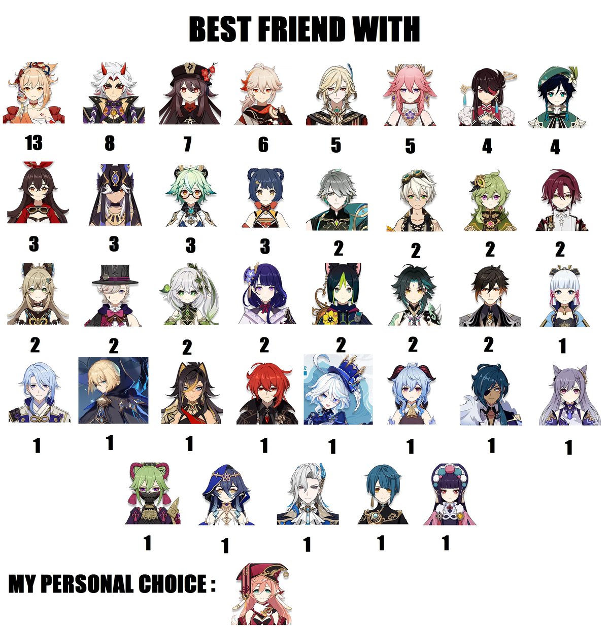 Вопросы были простыми. Во-первых, игрокам предлагалось представить, что персонажи Genshin Impact это реальные люди, а затем назвать героя, с которым им хотелось бы стать лучшими друзьями. Во-вторых, надо было назвать героя, с которым игрокам не хочется иметь ничего общего.