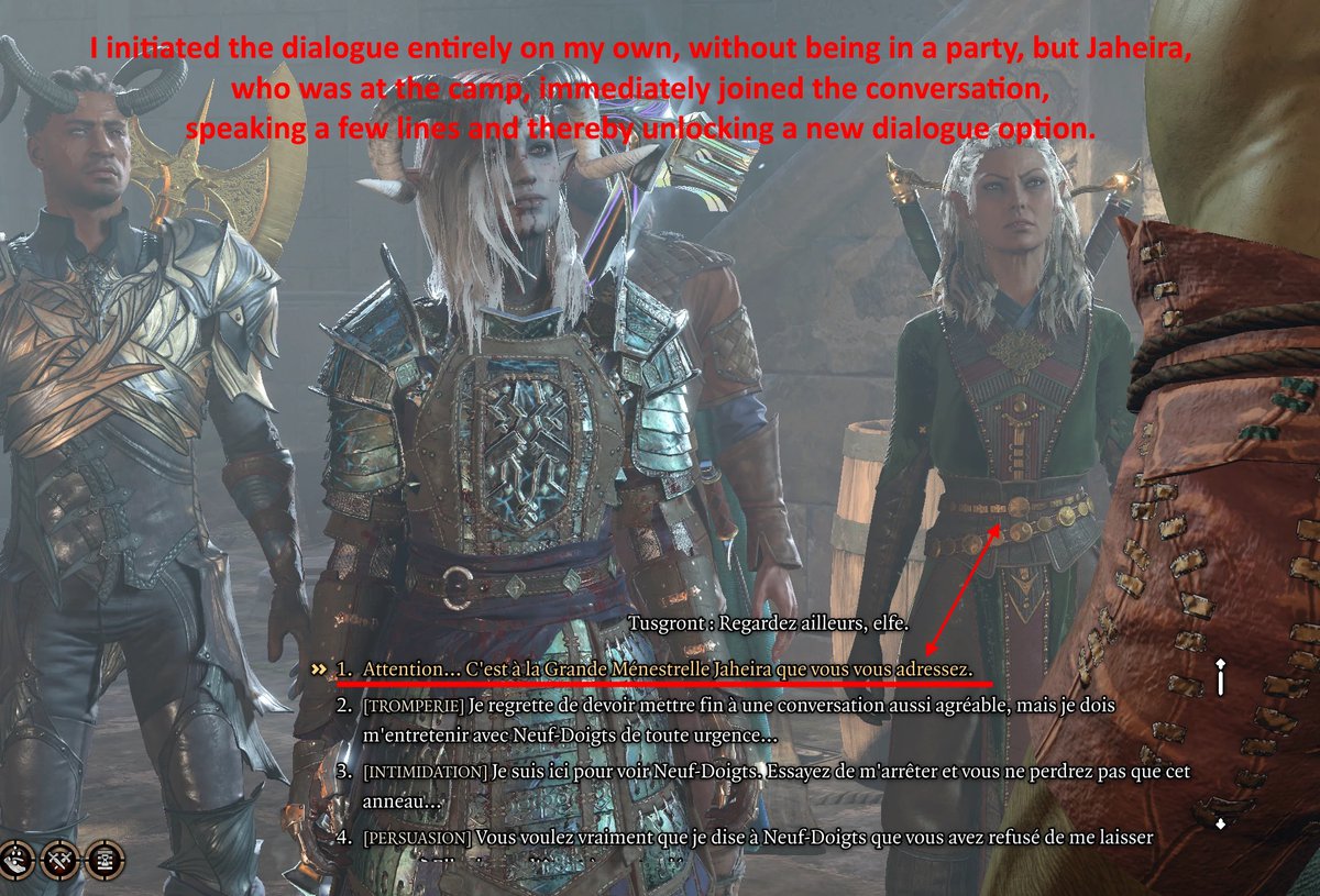 В удаленном режиме спутники могут не только реагировать на диалоги: в вариантах ответа появляются опции, привязанные к персонажам, не входящим в состав отряда игрока. Вот как это выглядит.
