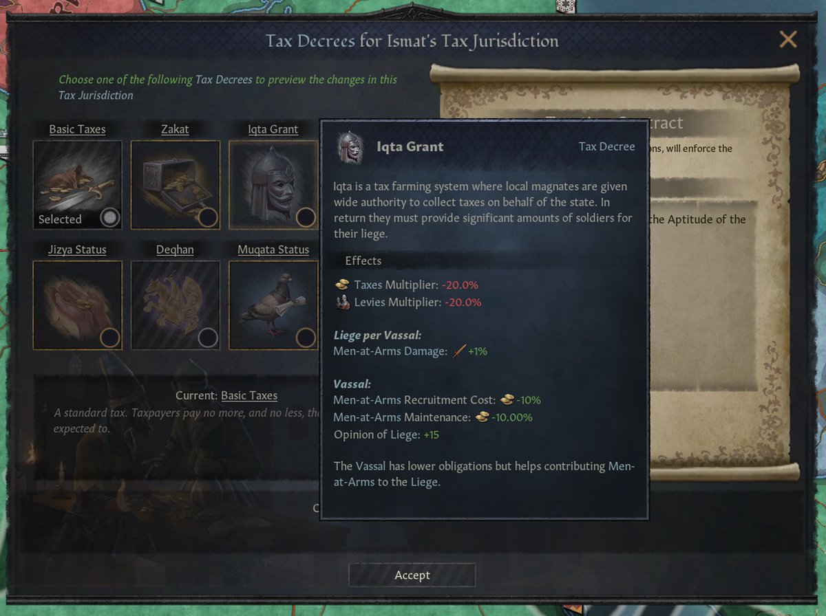 Будут доступны налоговые указы. Это что-то вроде вассальных контрактов, но на всю юрисдикцию разом. На скриншоте показано, что можно собирать меньше денег и людей, но сделать ополченцев сильнее, снизить их содержание, а также повысить мнение вассалов о правителе.