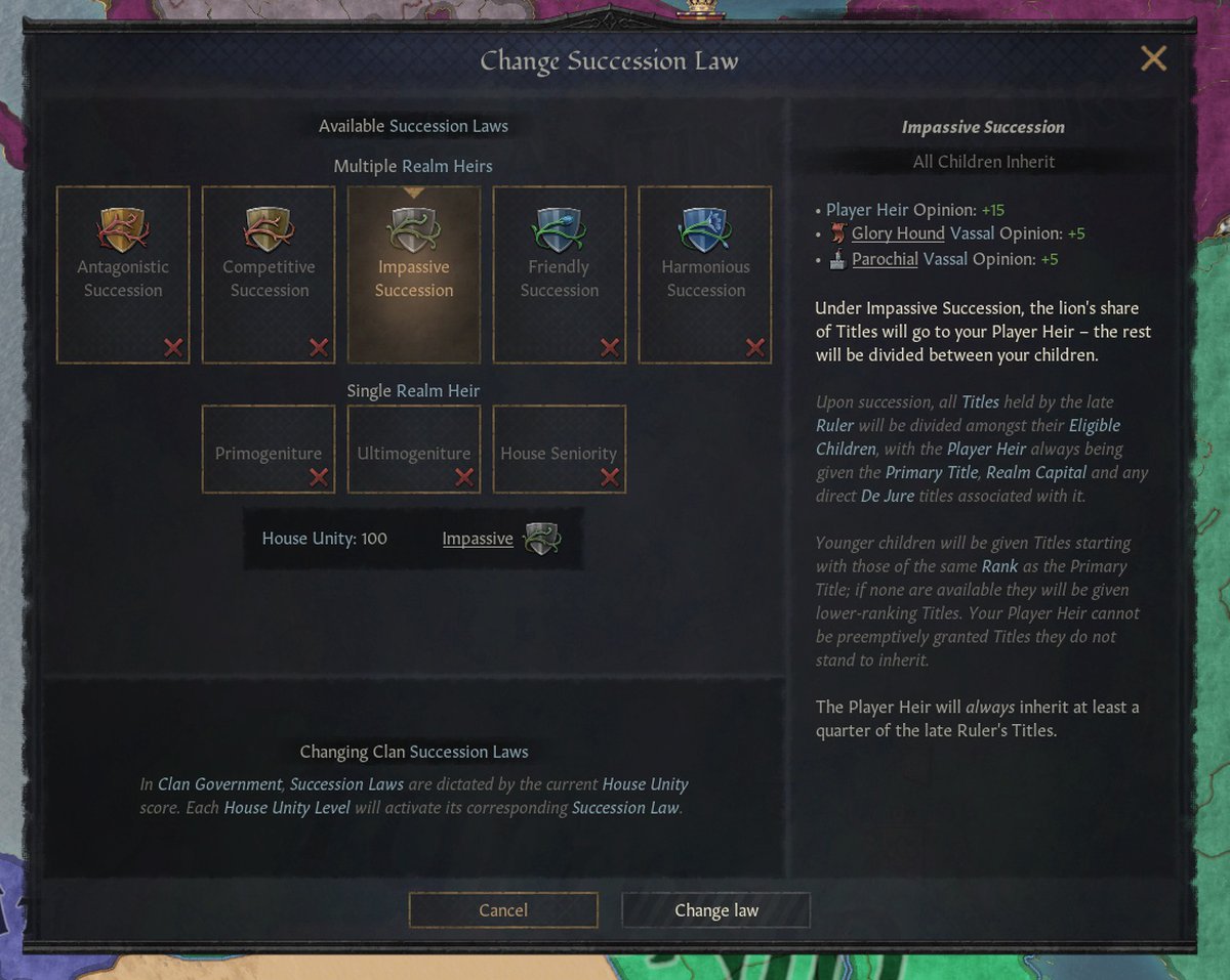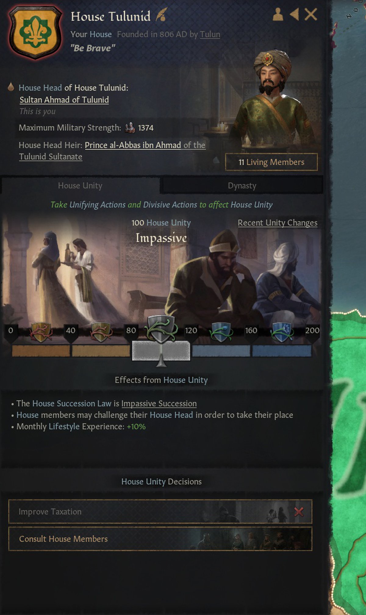 И вот тут становится страшно. От этой штуки зависит наследование титулов. Если клан антагонистичный, т.е. единство низкое, то наследники потребуют равные доли земель. А королевства терять бывает неприятно.