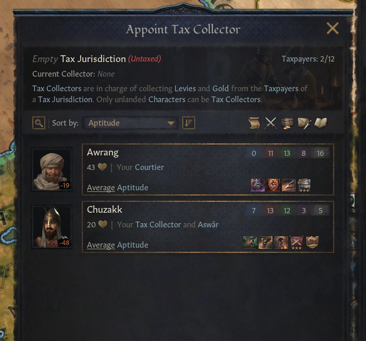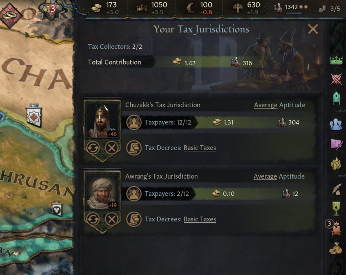 Важным показателем эффективности налоговиков является учёность, хотя и другие статы могут учитываться. Также важно их мнение о правителя. От этих двух показателей и будет зависеть размер налогов.