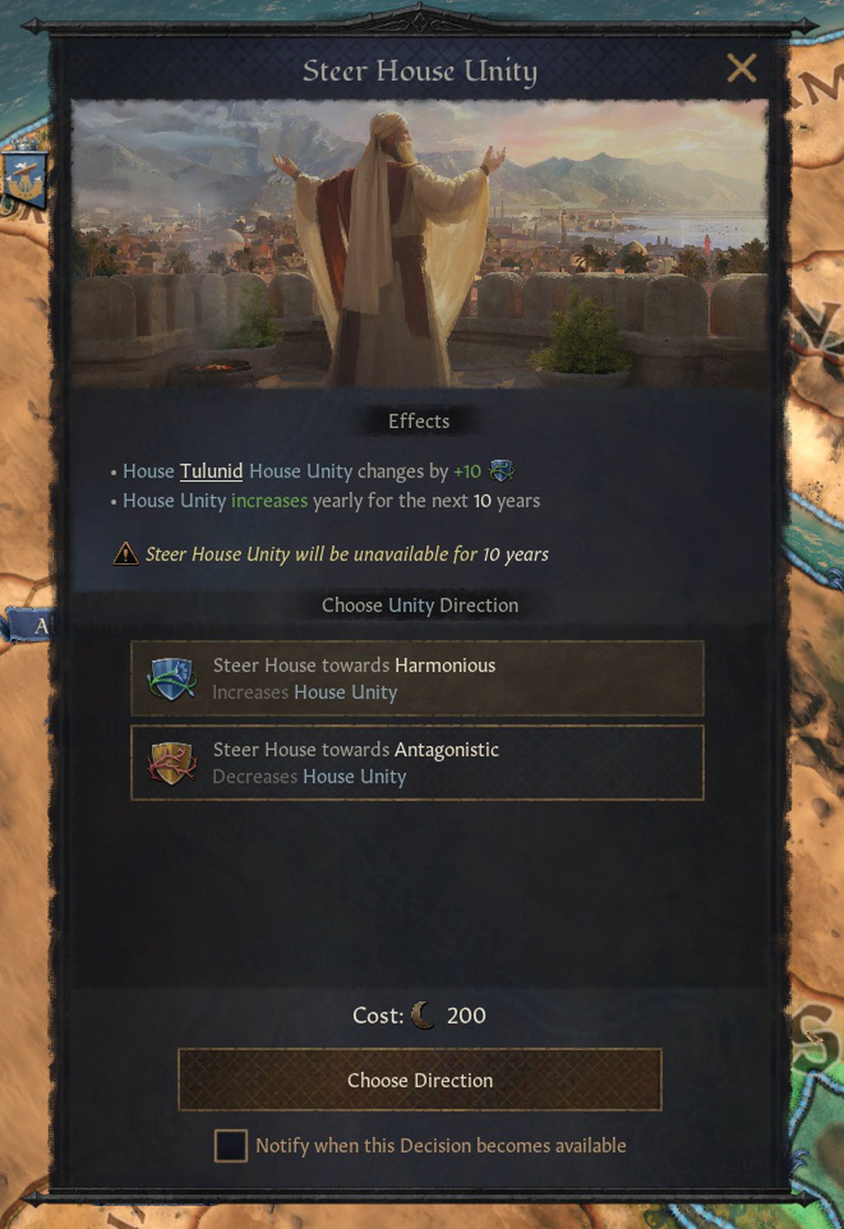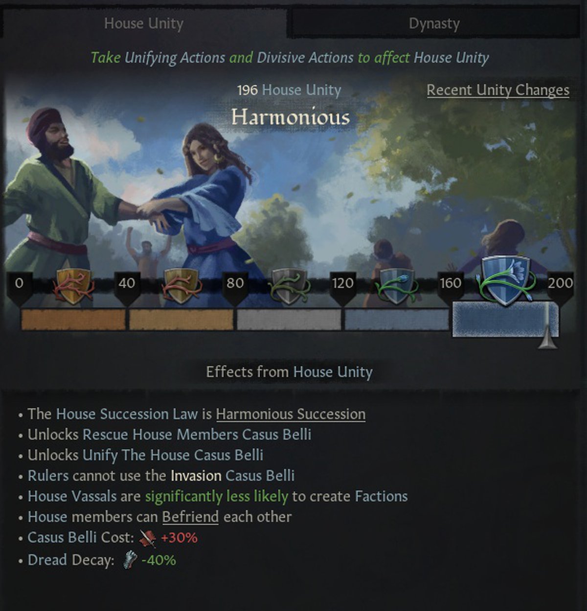 Единство меняется такими действиями: отбирание титулов и заключение членов клана - снижают, союзы и опекунство - повышают. Хотя у главы дома есть дополнительные решения для задания вектора развития. За них, правда, придётся благочестием платить.