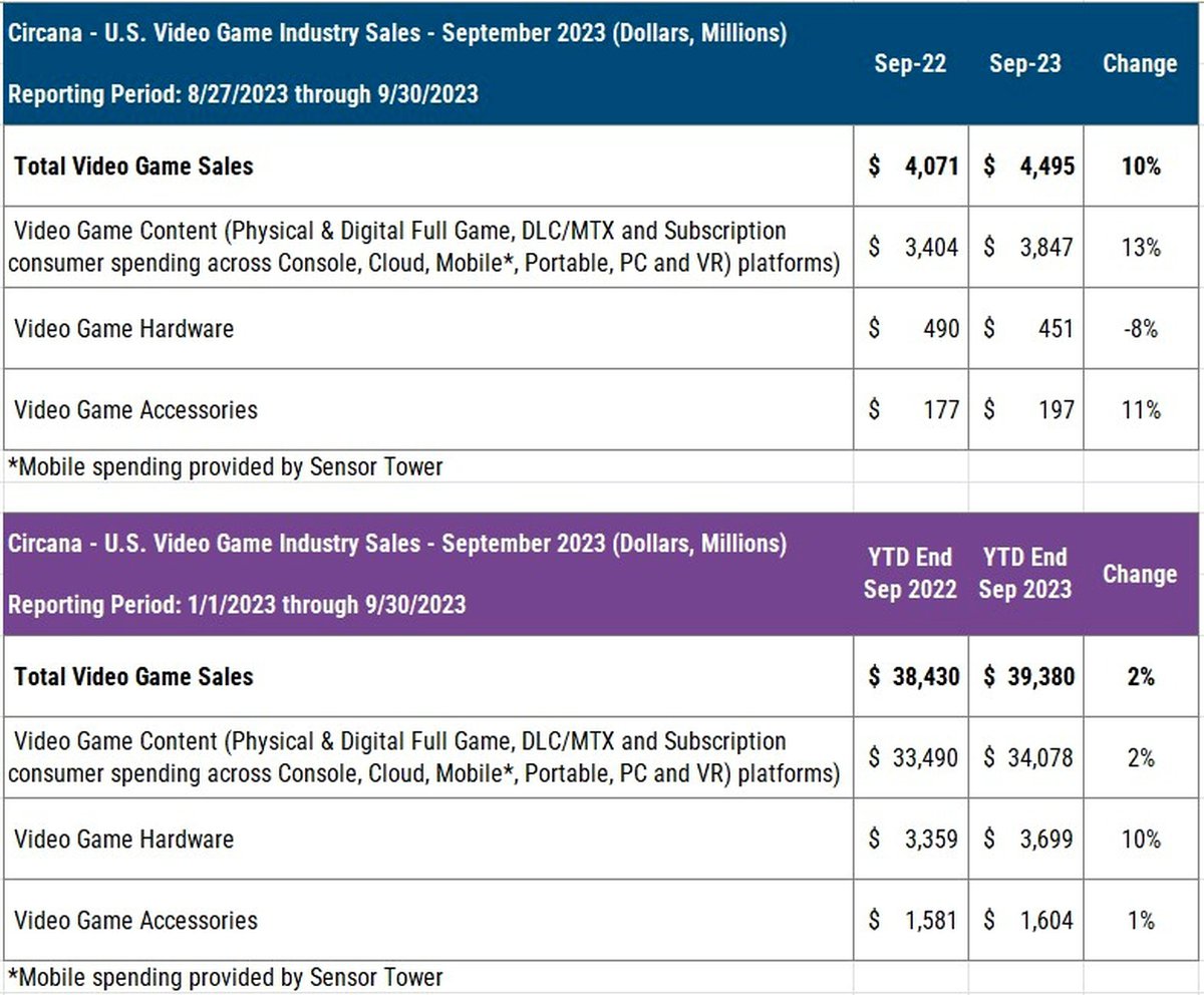Общий объем американского игрового рынка в сентябре 2023 года составил $4.495 миллиарда, это на 10% больше, чем в 2022 году. Продажи консолей упали на 8% к прошлому году, зато выросли продажи игр и аксессуаров.