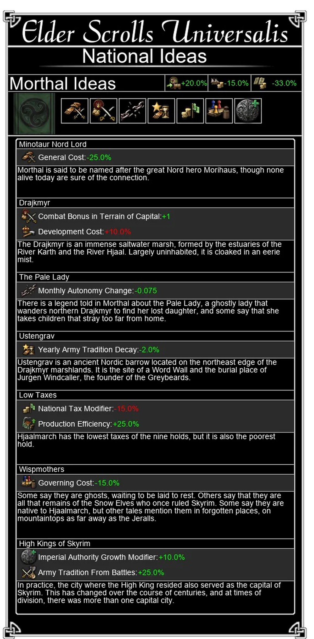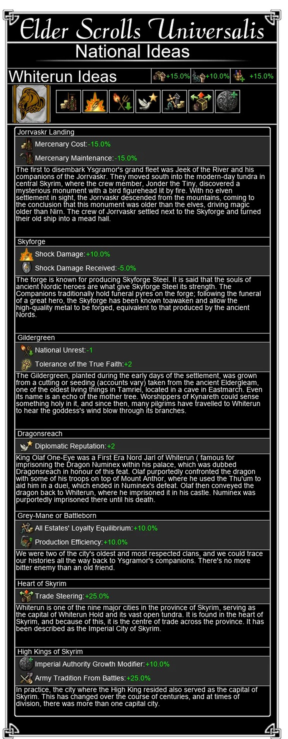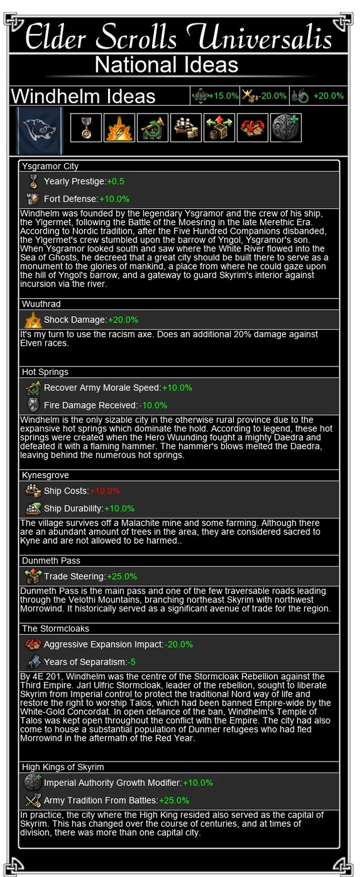 Elder Scrolls Universalis - модификация для глобальной стратегии Europa Universalis IV, действие которой происходит в мире The Elder Scrolls. В последнее время авторы делают странам по всему Тамриэлю новые национальные идеи. Сегодня они рассказали, какие идеи получат владения Скайрима, и главное - почему.