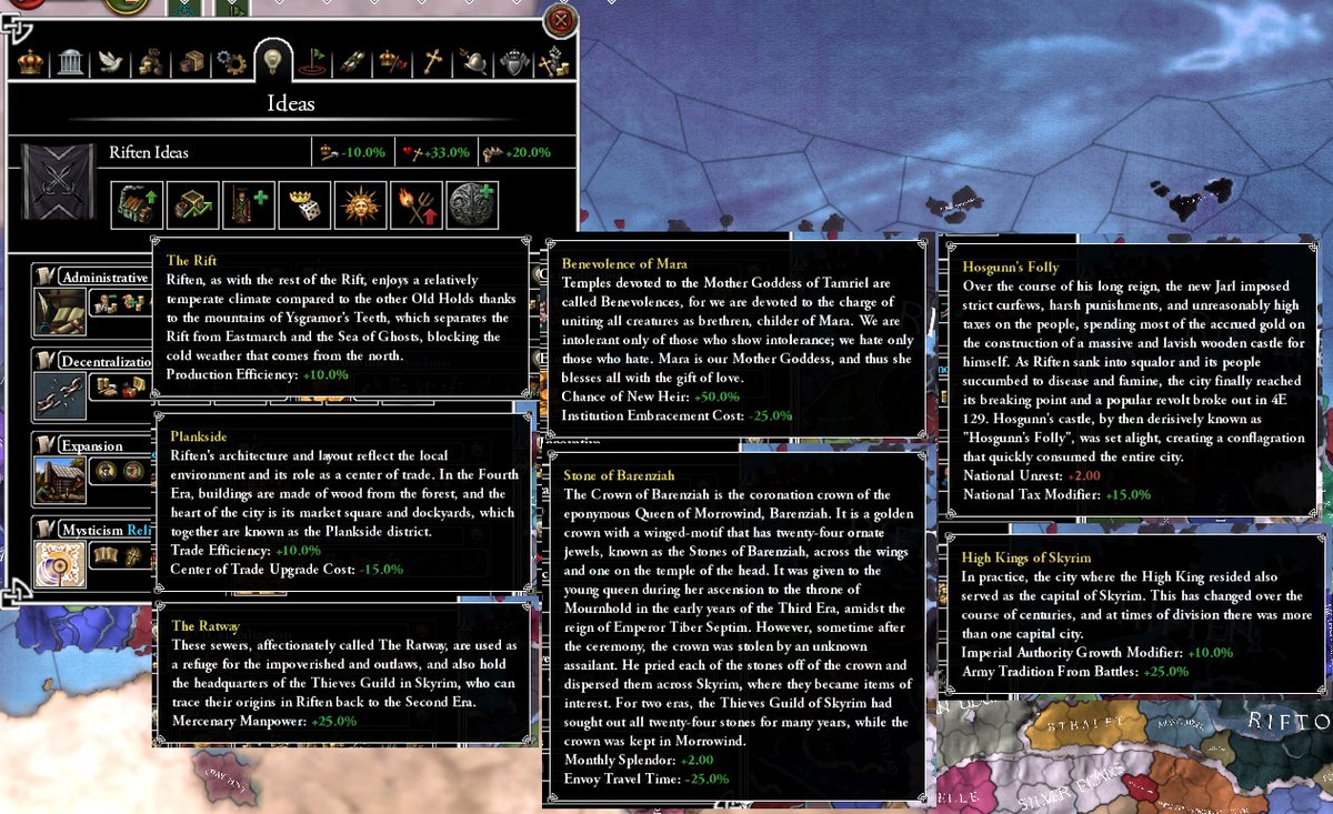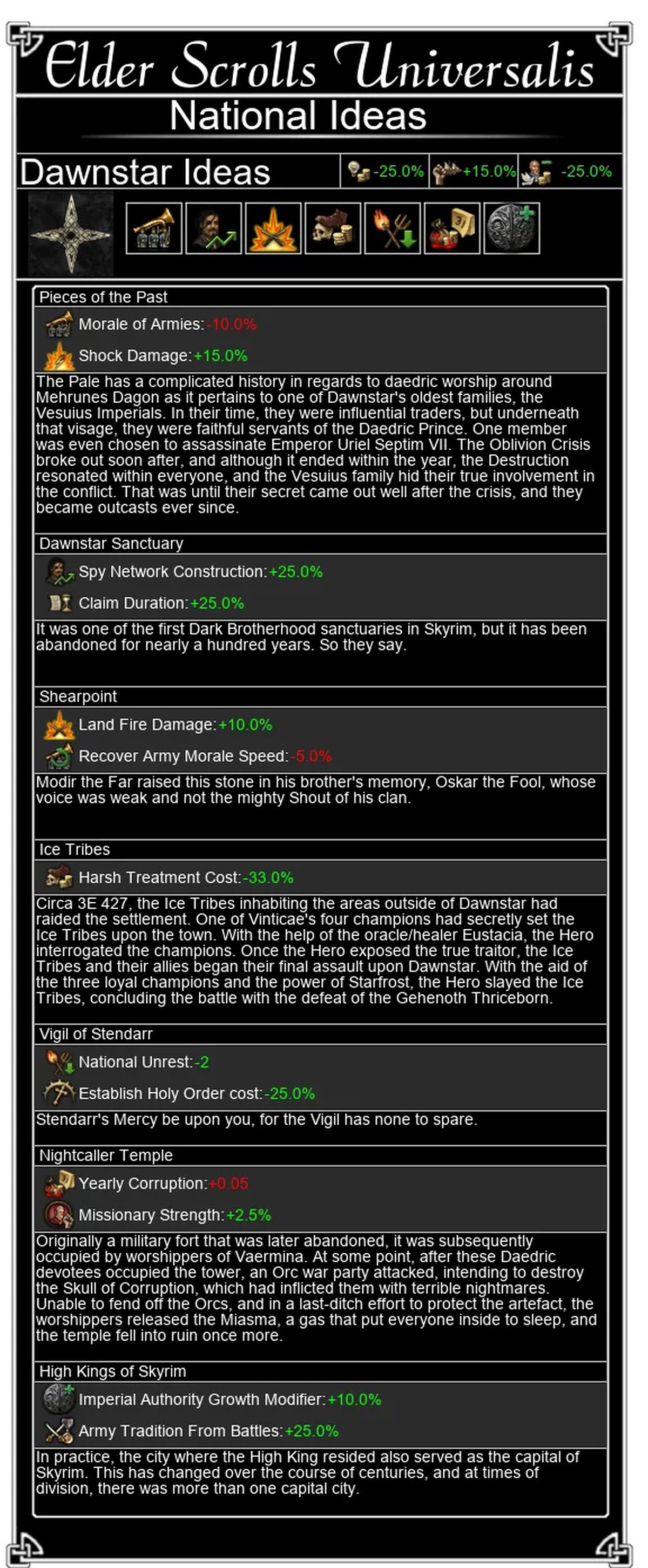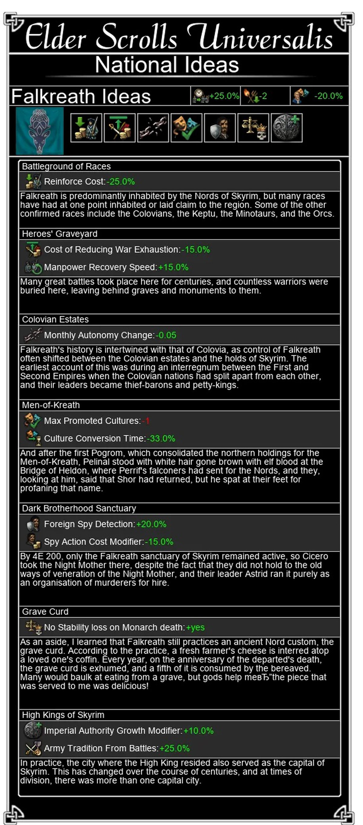Elder Scrolls Universalis - модификация для глобальной стратегии Europa Universalis IV, действие которой происходит в мире The Elder Scrolls. В последнее время авторы делают странам по всему Тамриэлю новые национальные идеи. Сегодня они рассказали, какие идеи получат владения Скайрима, и главное - почему.