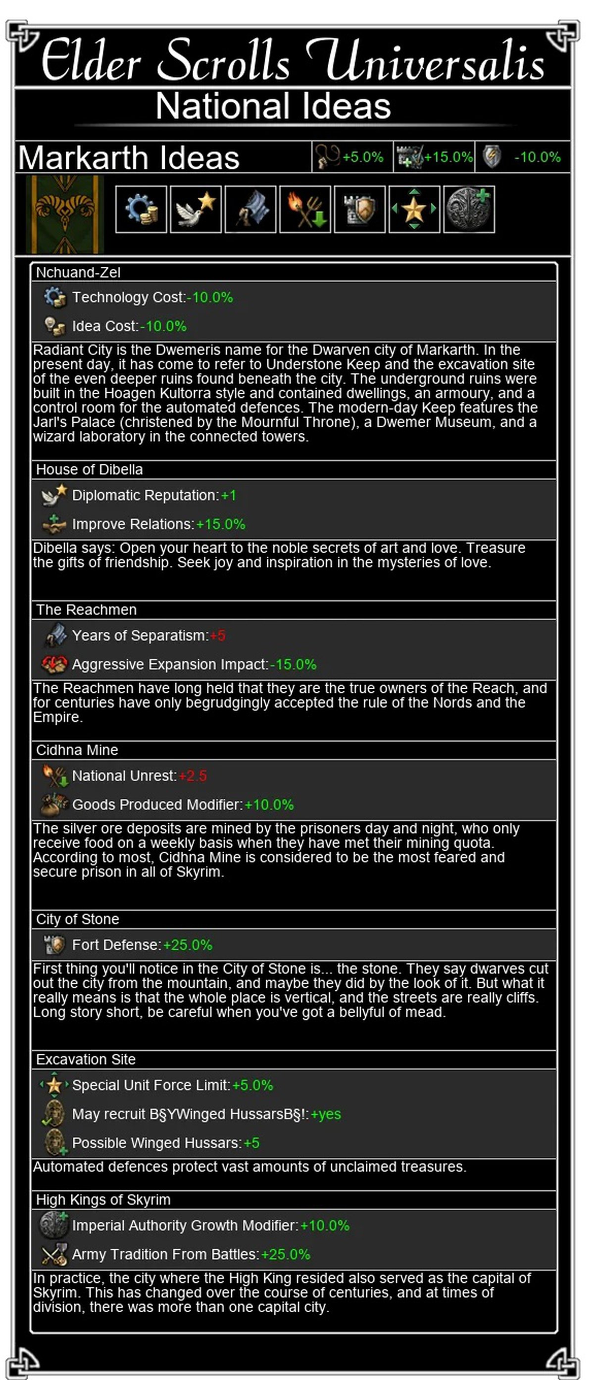 - Когда-то в Маркарте верховный король Скайрима заседал - город был столицей. Закрытие идеи повысит прирост имперского авторитета на 10%, получение традиций в битвах на 15%.