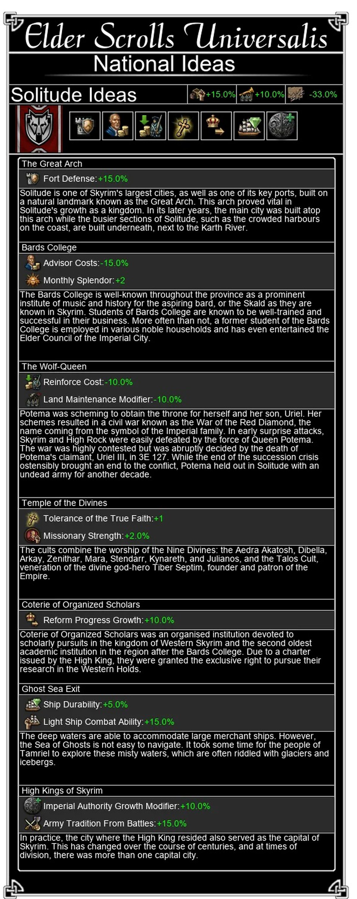 - Именно в Солитьюде находится храм всех Девяти Богов. Закрытие идеи повысит толерантность государства к гос. религии на 1, а также повысит силу миссионеров на 2%.