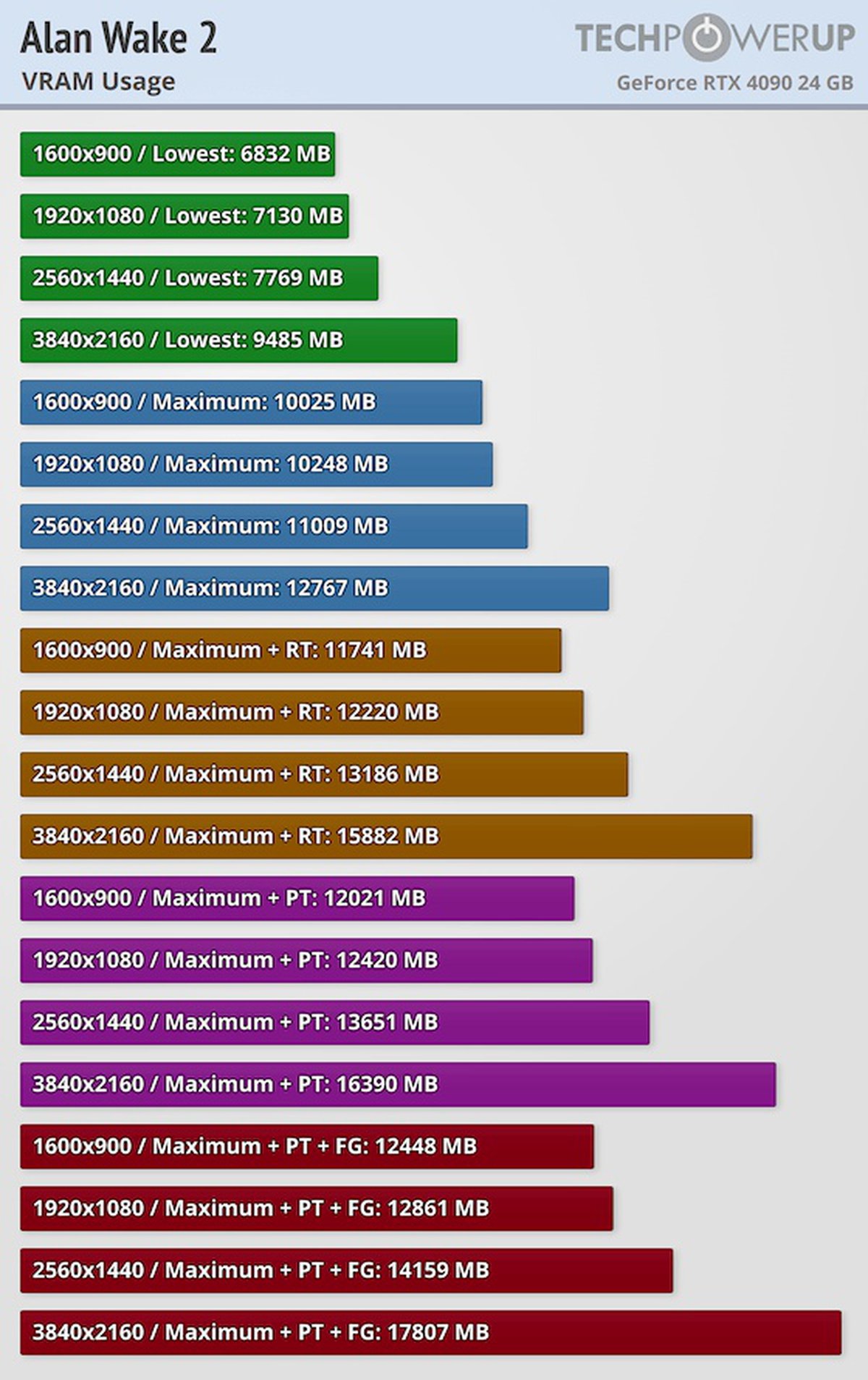 Также издание протестировало нагрузку на видеопамять в зависимости от уровня настроек и разрешения. Alan Wake 2 любит видеопамять: на минимальных настройках в разрешении 900p игре уже нужно почти 7 гигабайт.
