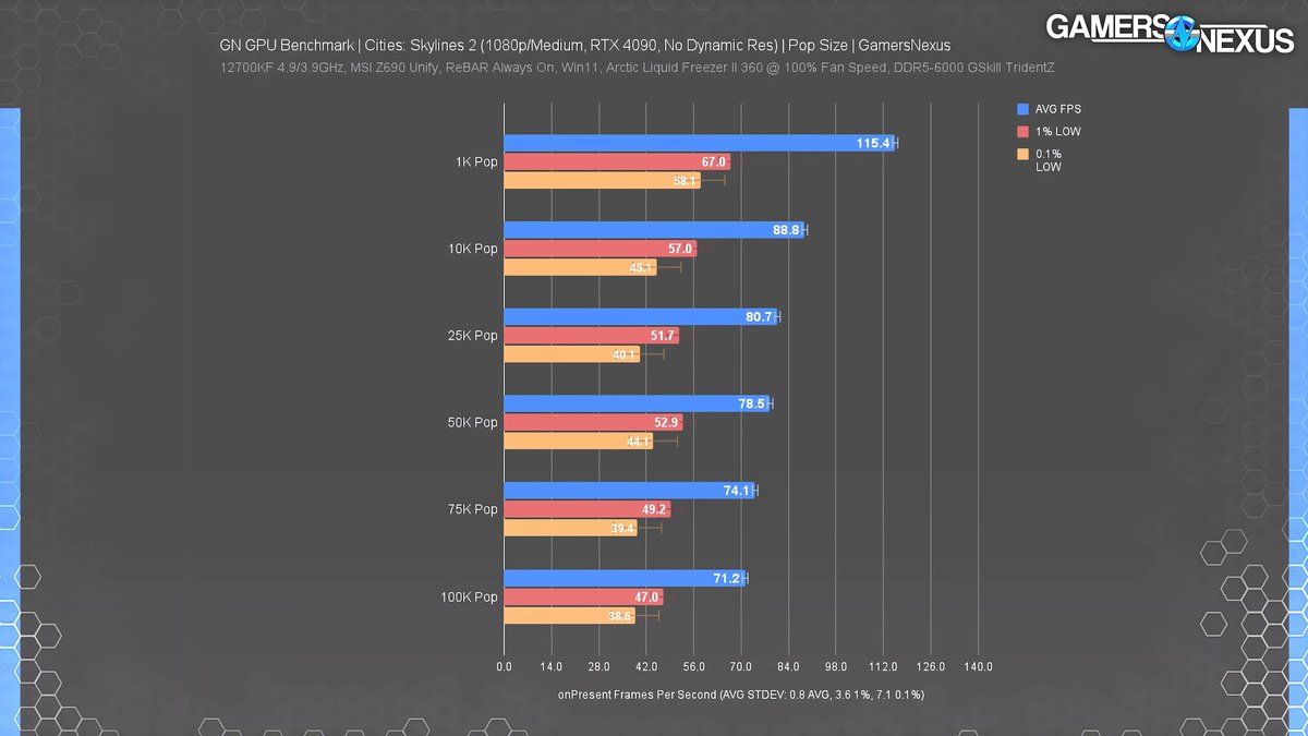 Во время тестов журналисты обнаружили, что частота кадров меняется в зависимости от числа жителей в городе. Интересно, что самое большое падение происходит между 1 тысячей жителей и 10 тысячами жителей: оно сильнее, чем между 10 и 100 тысячами жителей.